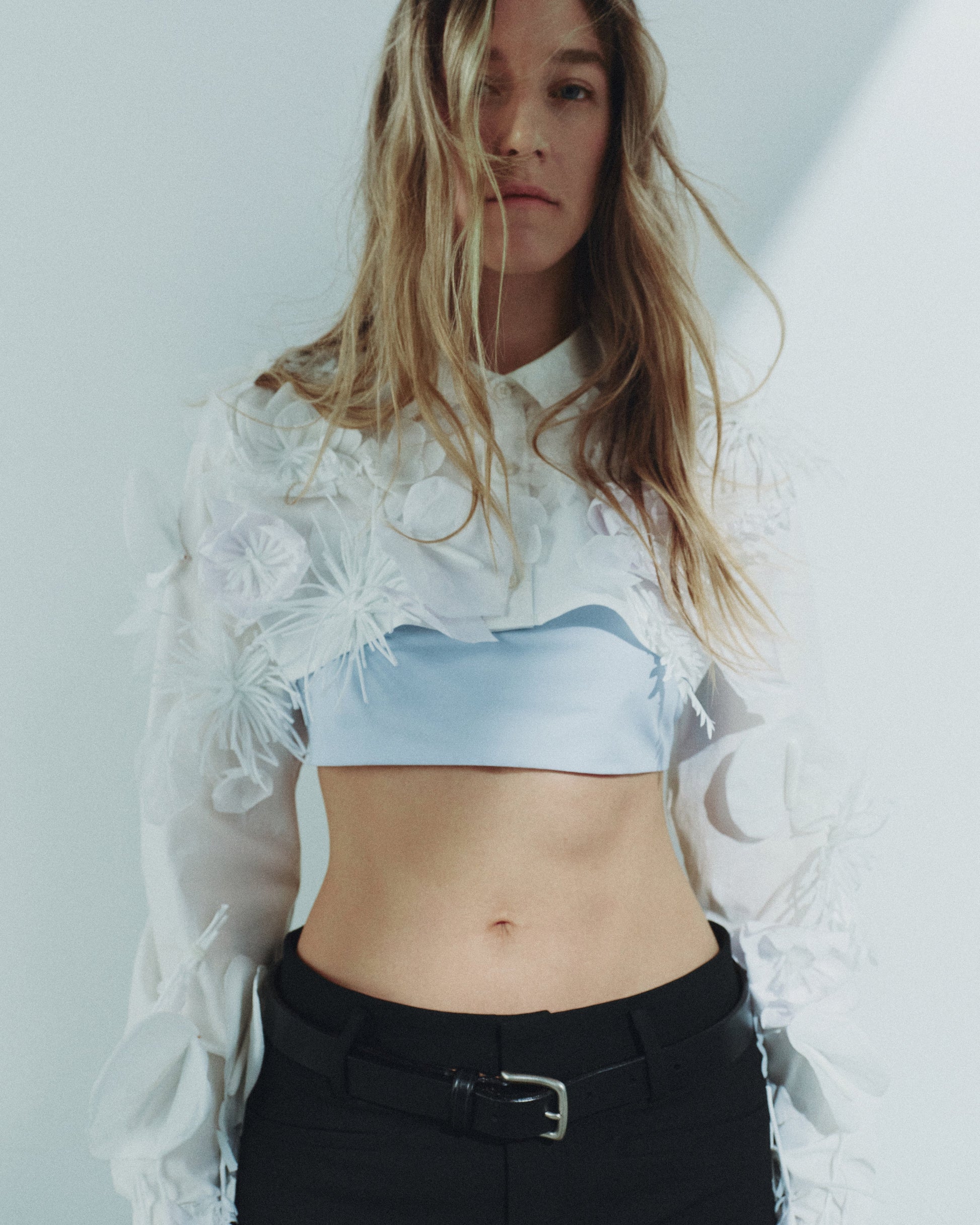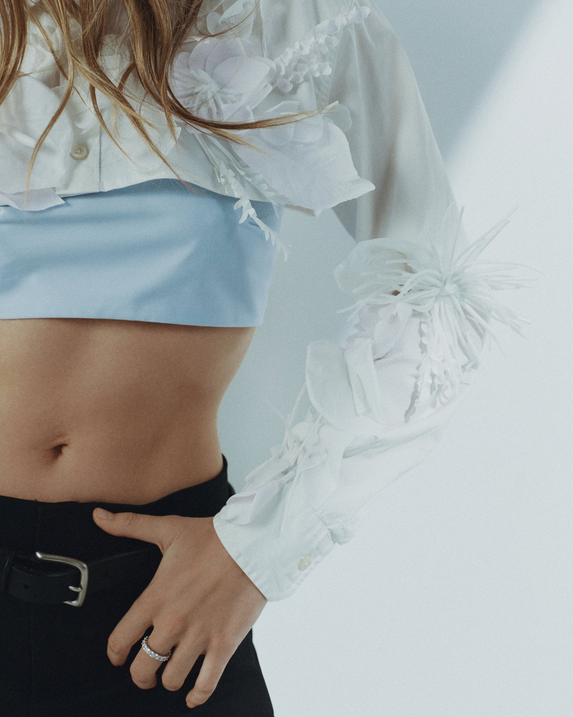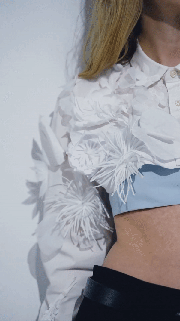 Elevate your style with this chic cropped shirt, beautifully decorated with handmade flowers for a unique and artistic touch. Its bold yet feminine design pairs perfectly with any outfit, making it a must-have piece for those who appreciate craftsmanship and individuality.