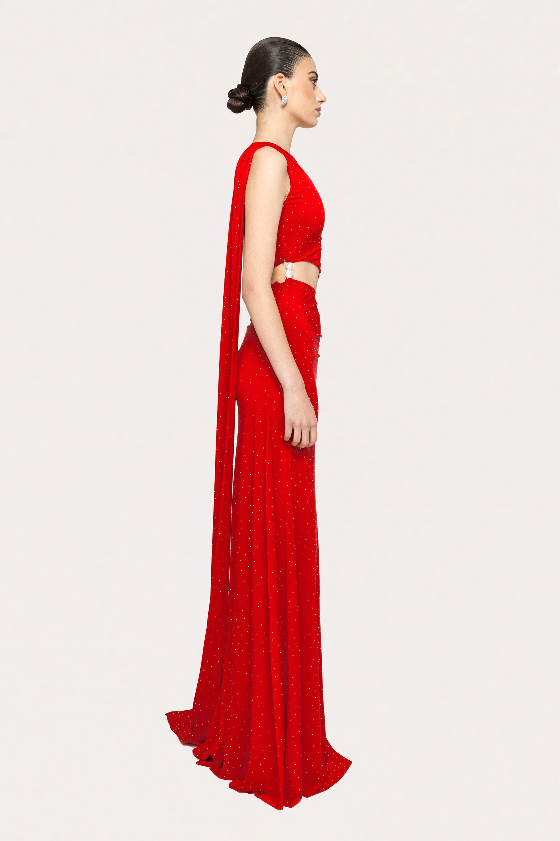 Glamorous and radiant, this red rhinestone-embellished gown sparkles with every movement, perfect for formal occasions, weddings, and gala evenings.