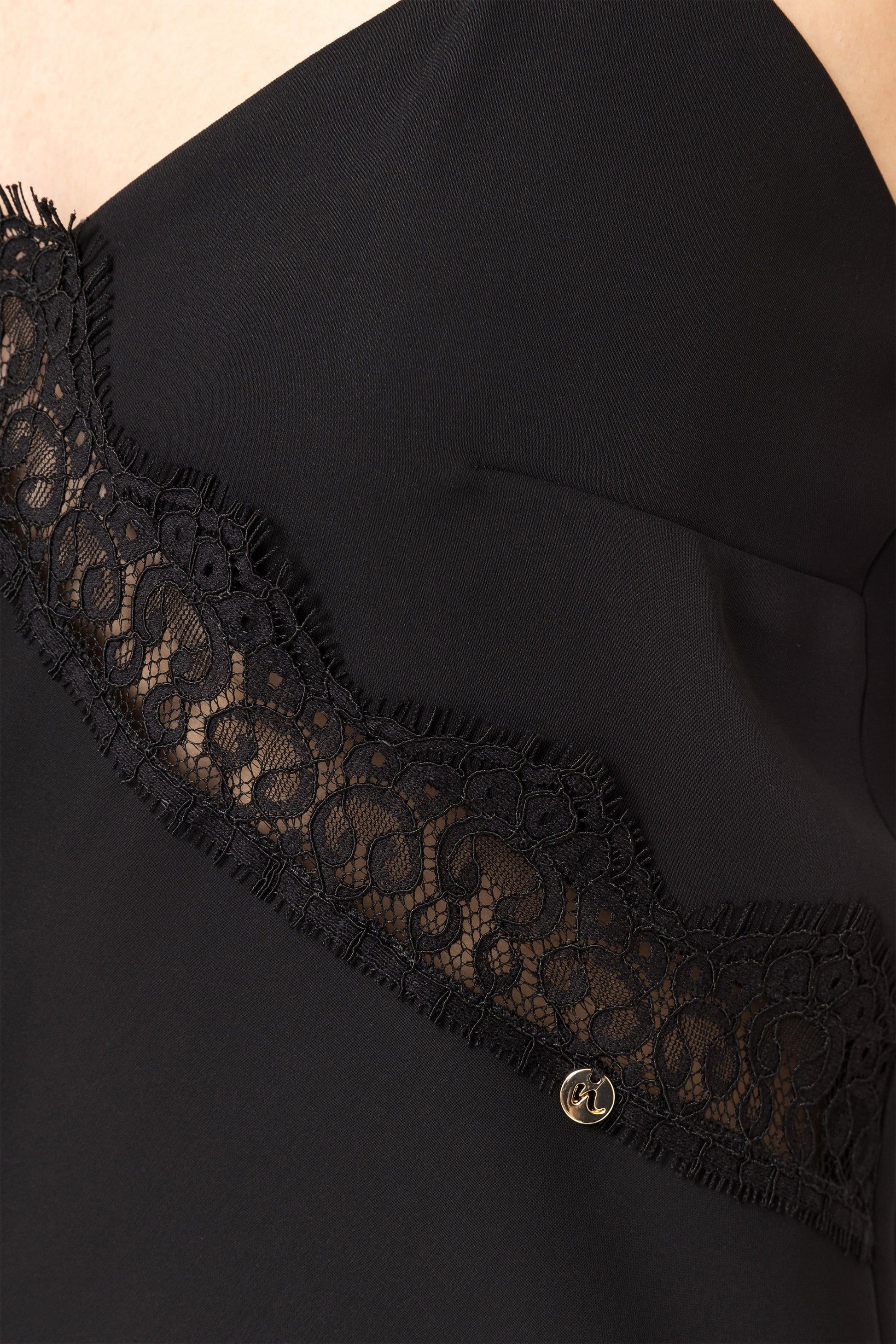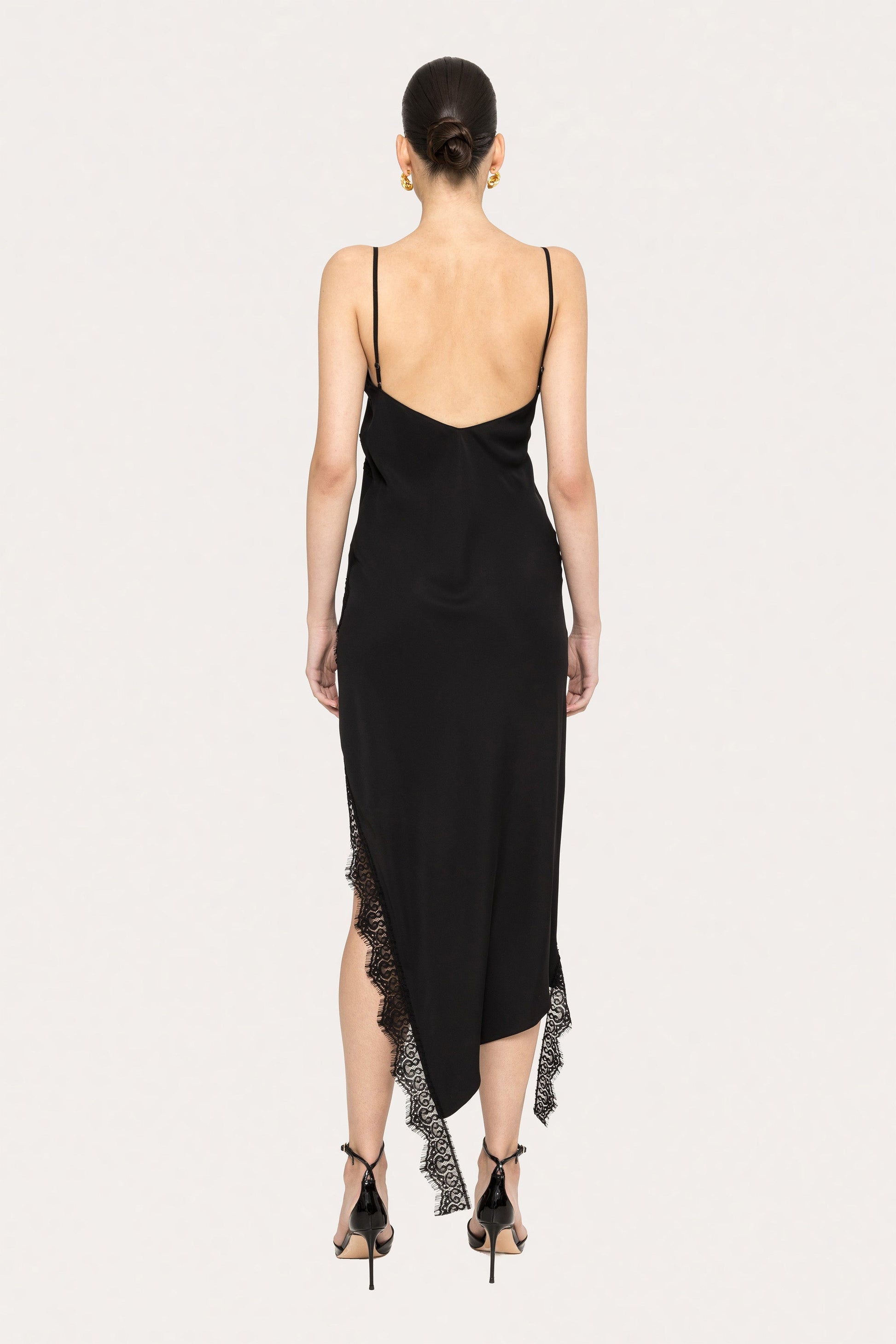 Chic and versatile, this black midi dress features asymmetrical cuts and delicate lace trim, perfect for club nights, parties, or summer events.
