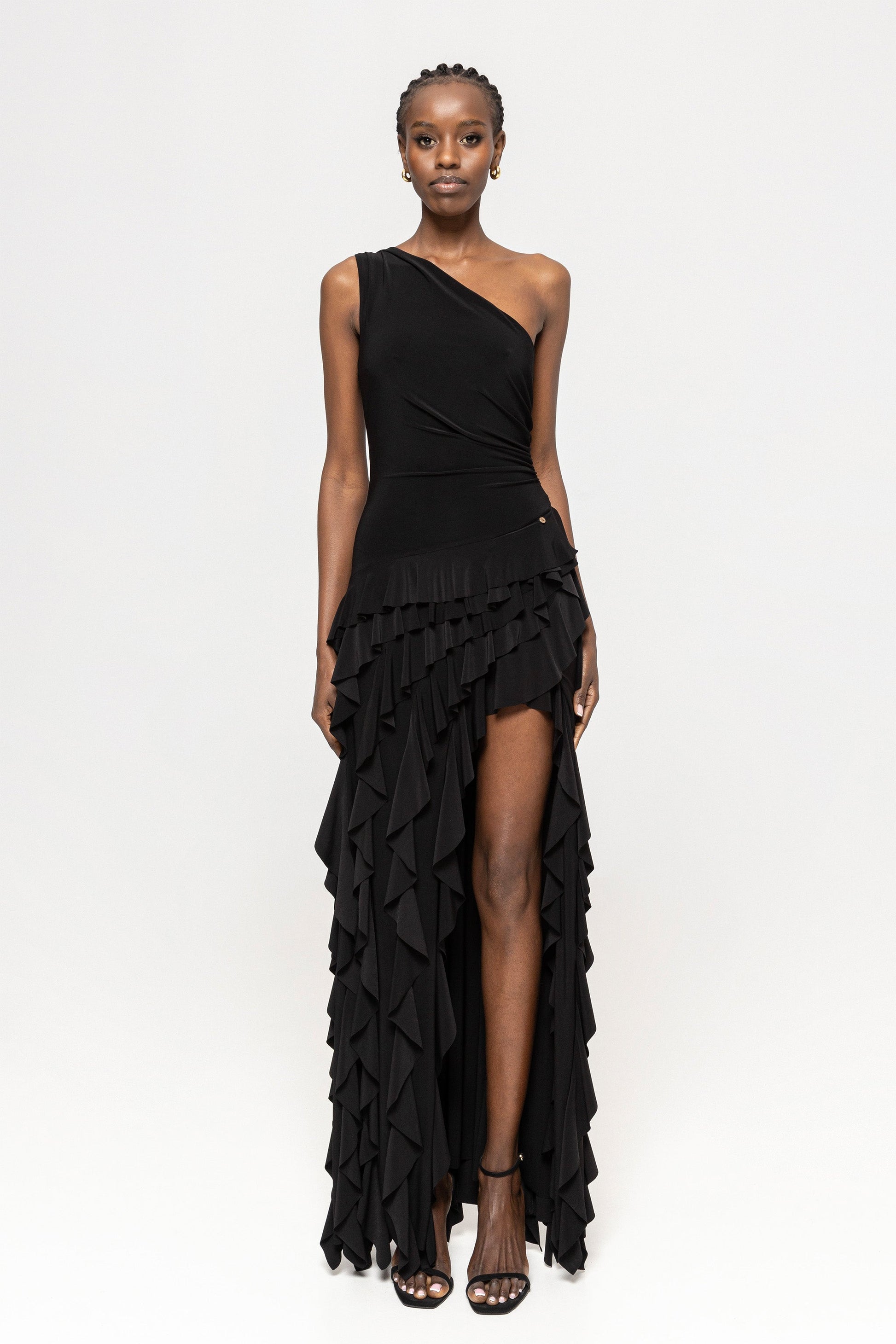Chic and feminine, this lycra ruffled maxi dress hugs the silhouette while offering flowing ruffle accents, perfect for evening parties, club events, and elegant occasions.