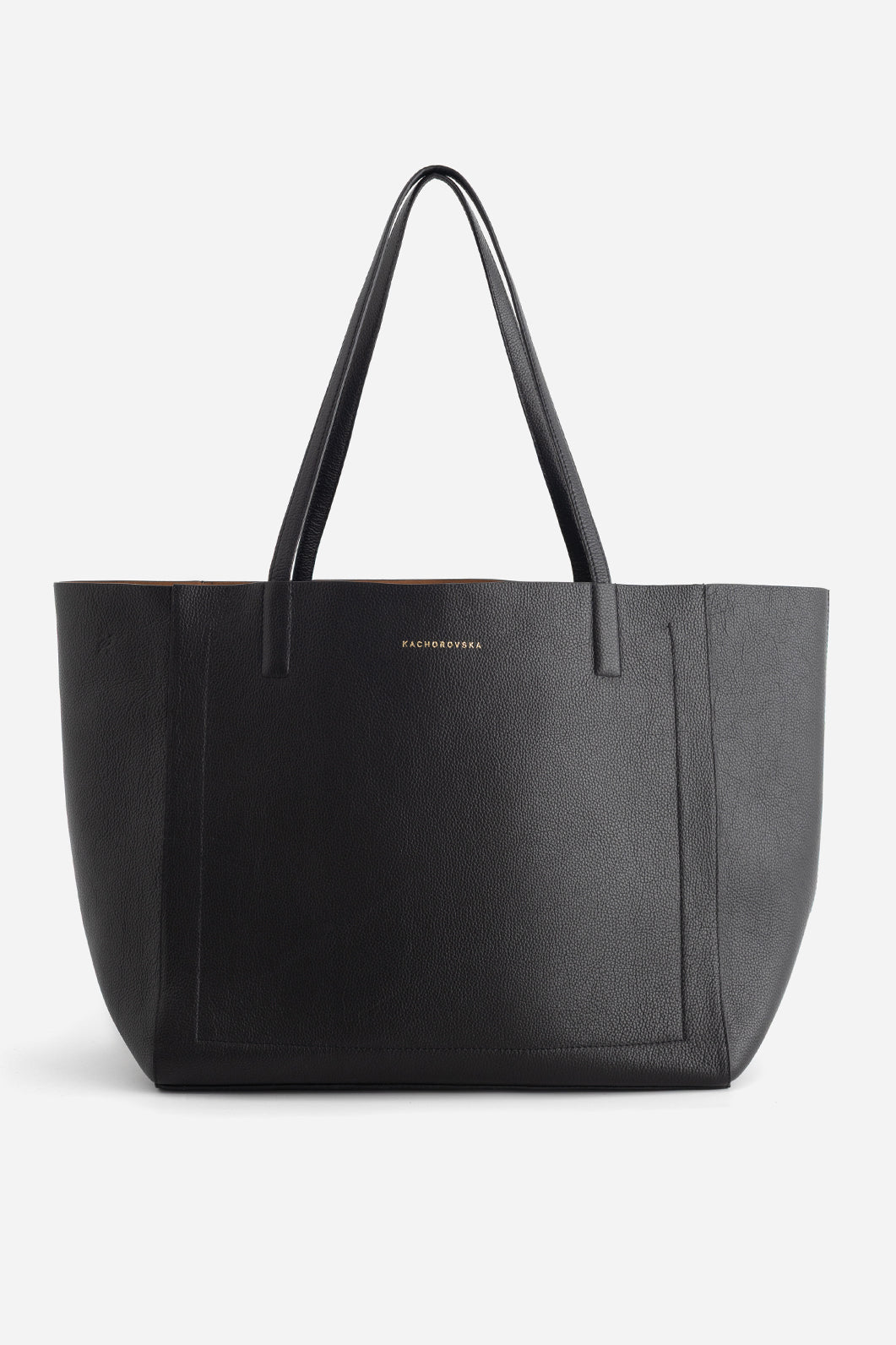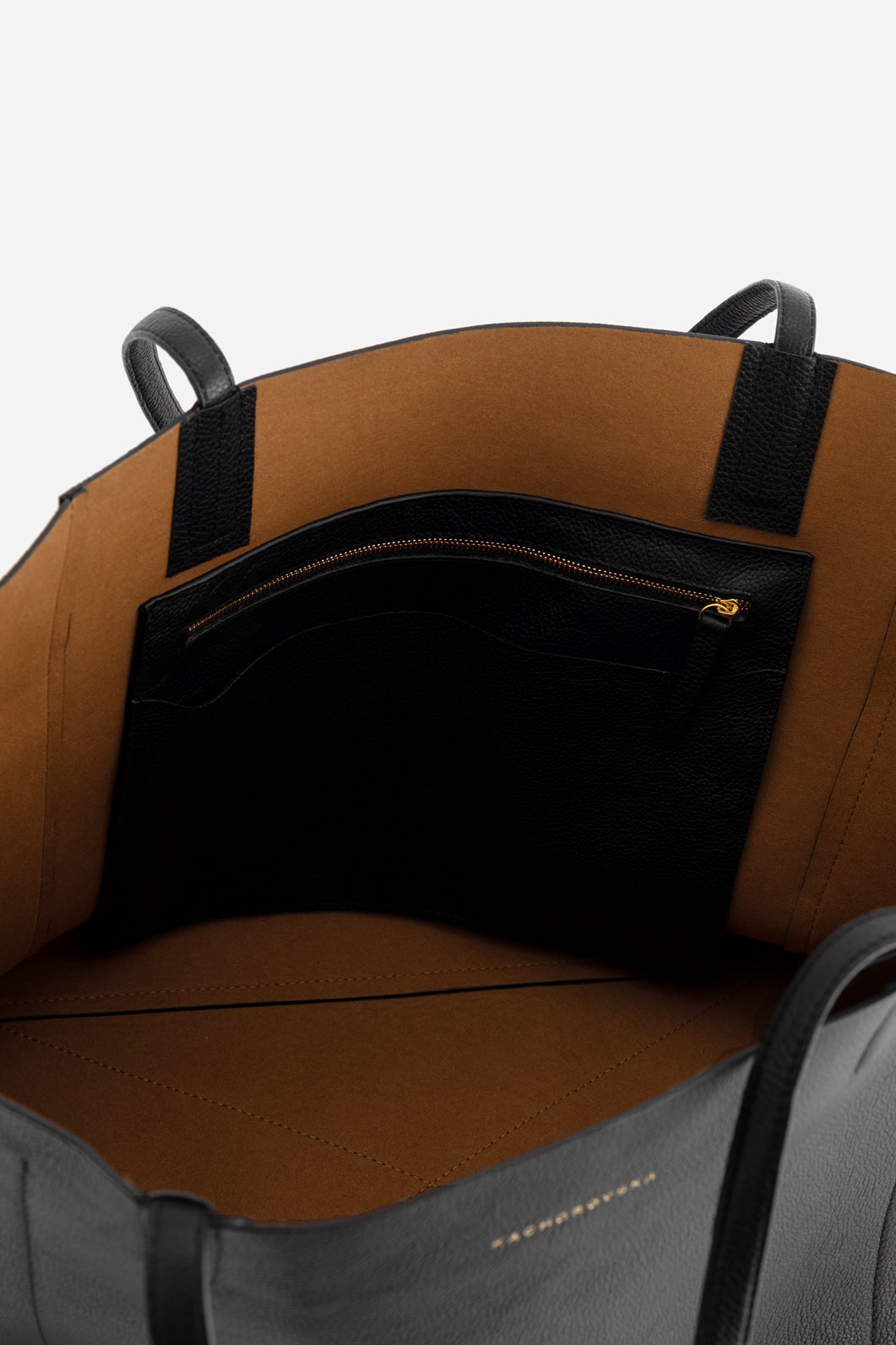 A versatile basic leather shopper with one spacious main compartment, crafted from black textured natural leather. Inside, it features a double pocket — one zippered and one open. The lining is made of natural leather. The bag easily fits all daily essentials.