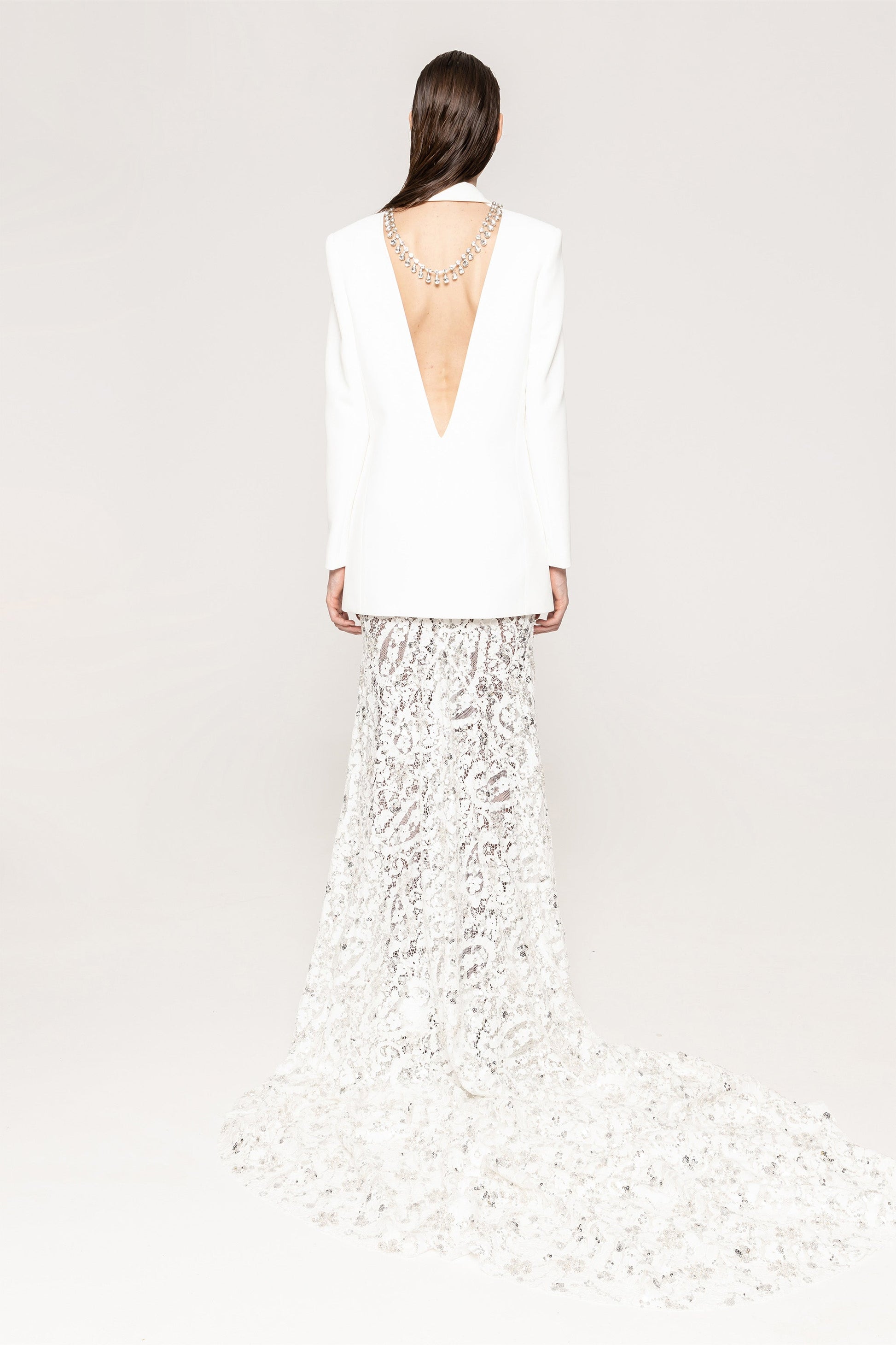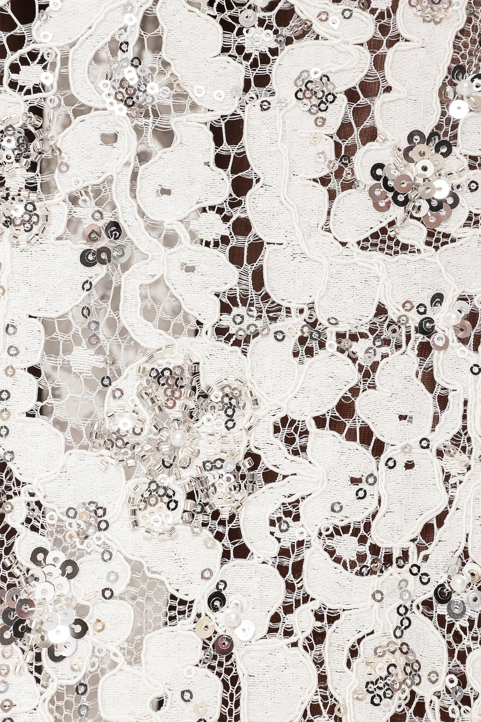 Elegant and shimmering, this white lace maxi skirt is adorned with delicate sequins, perfect for formal occasions and festive celebrations.