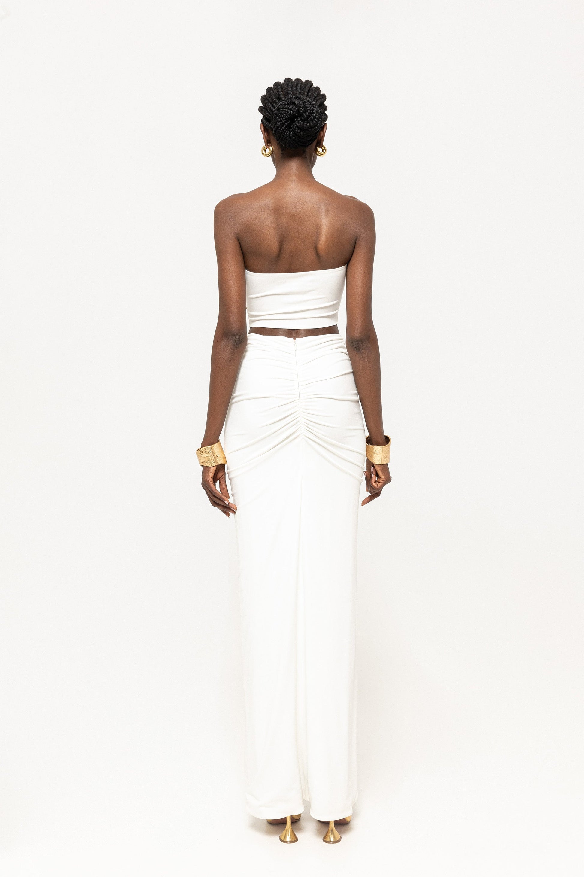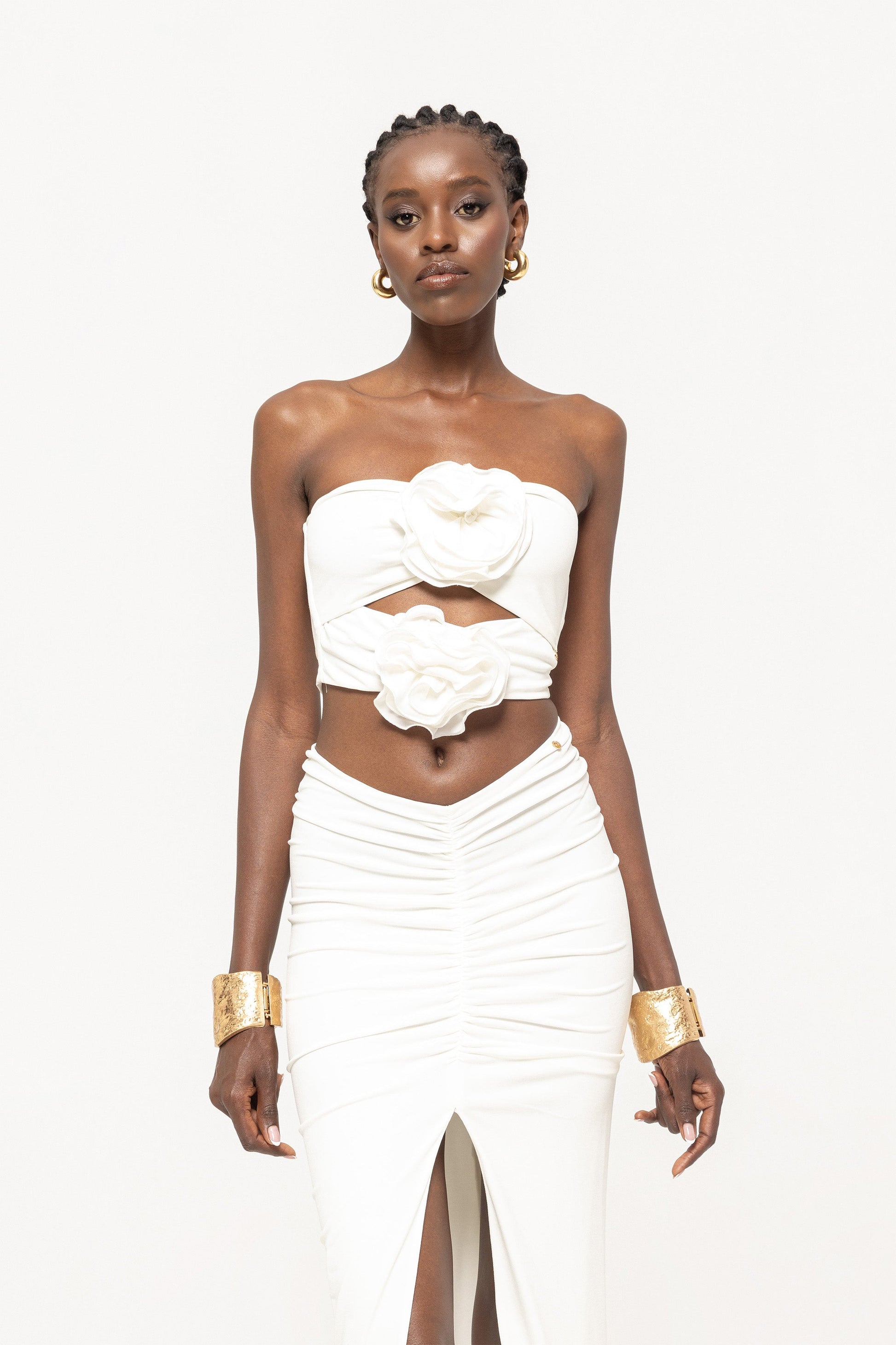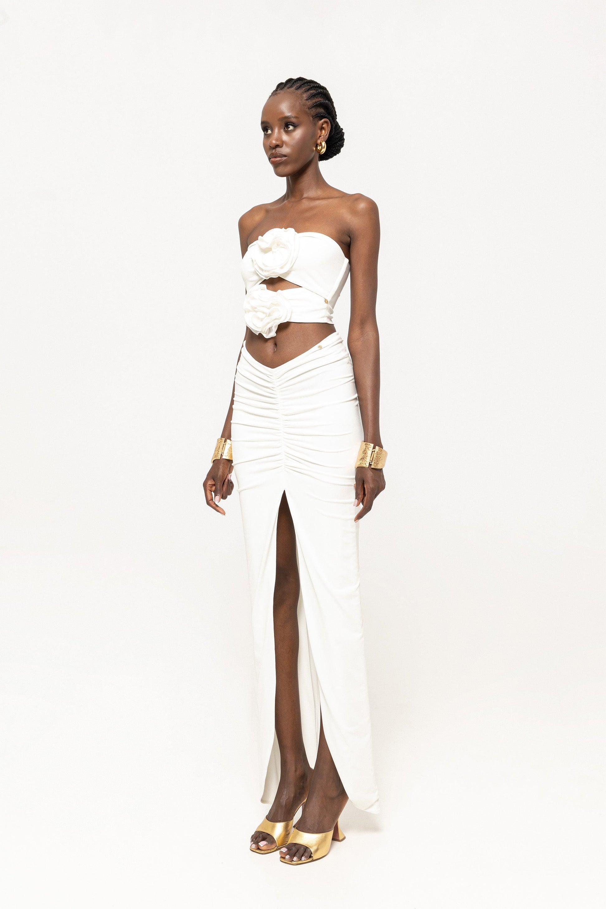Light and graceful, this white set combines a floral-appliqué crop top with a flowing maxi skirt. Ideal for summer days, beach evenings, or relaxed ceremonies.