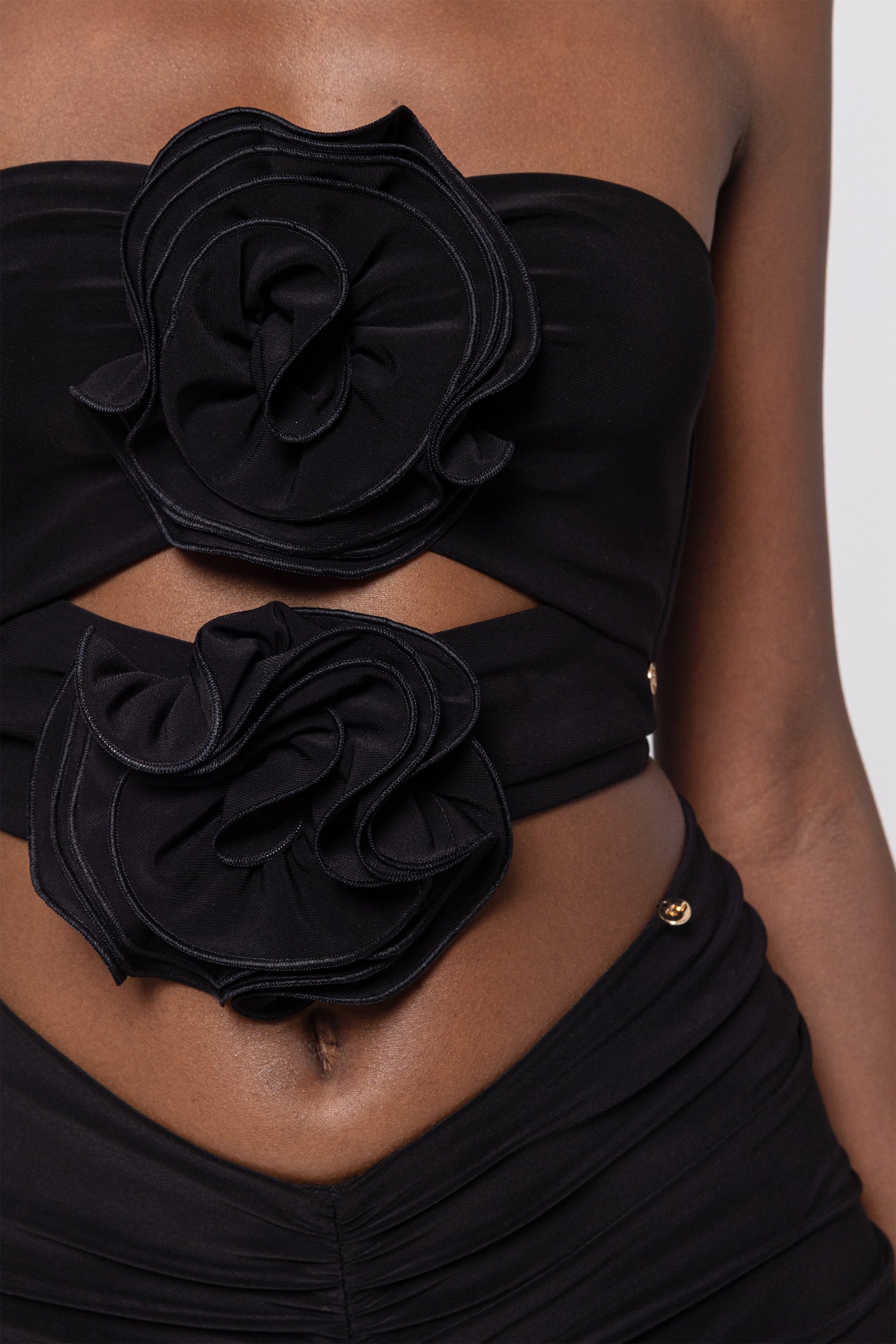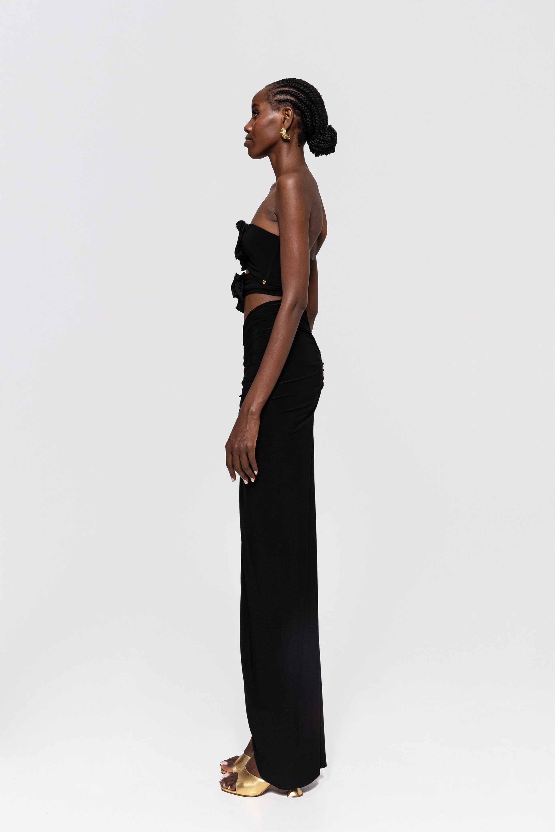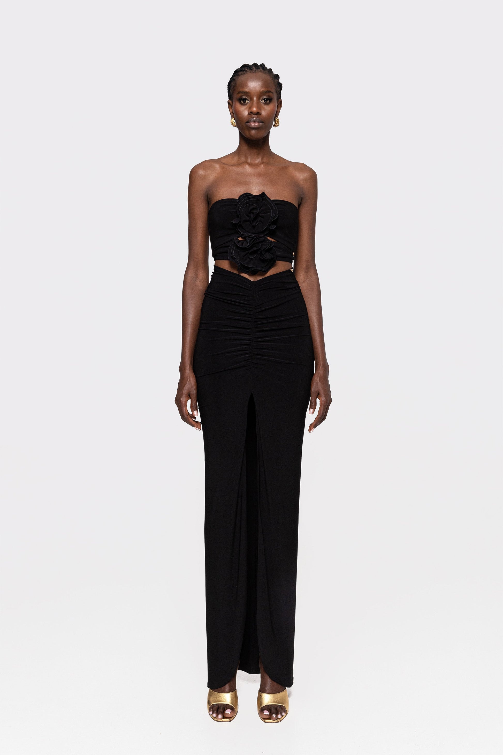 Light and graceful, this white set combines a floral-appliqué crop top with a flowing maxi skirt. Ideal for summer days, beach evenings, or relaxed ceremonies.