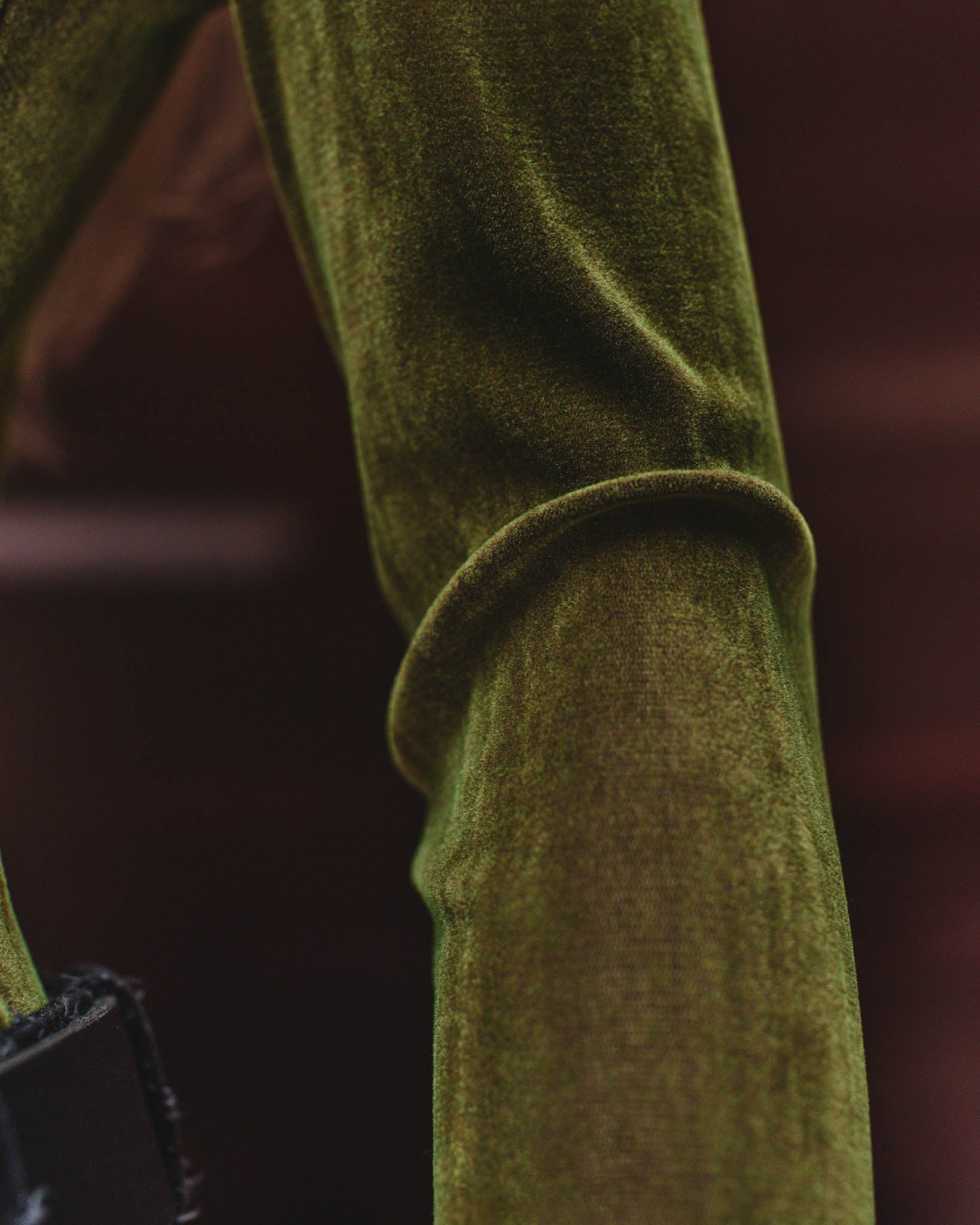 The Sheen Velvet Top is an exercise in tactile elegance, designed to be a fundamental yet luxurious wardrobe element. It is crafted from a sublimely soft Japanese velvet jersey, distinguished by its subtle lustre, translucent, and fluid drape that gracefully contours the body. This piece serves as an elevated foundation, effortlessly transitioning from a discreet layering piece to a sophisticated statement on its own.