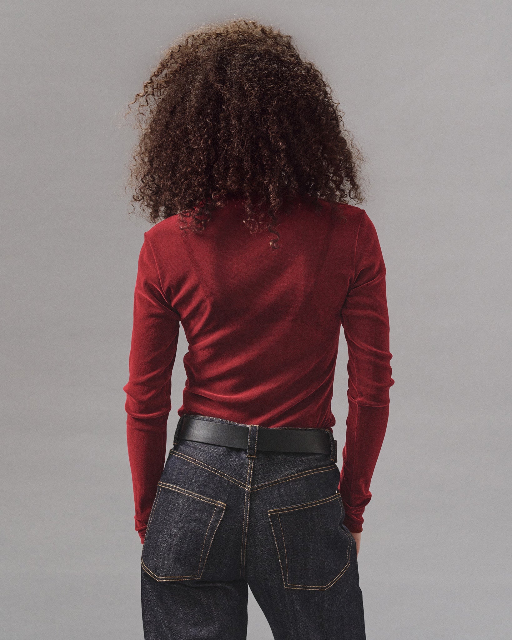 The Sheen Velvet Top is an exercise in tactile elegance, designed to be a fundamental yet luxurious wardrobe element. It is crafted from a sublimely soft Japanese velvet jersey, distinguished by its subtle lustre, translucent, and fluid drape that gracefully contours the body. This piece serves as an elevated foundation, effortlessly transitioning from a discreet layering piece to a sophisticated statement on its own.