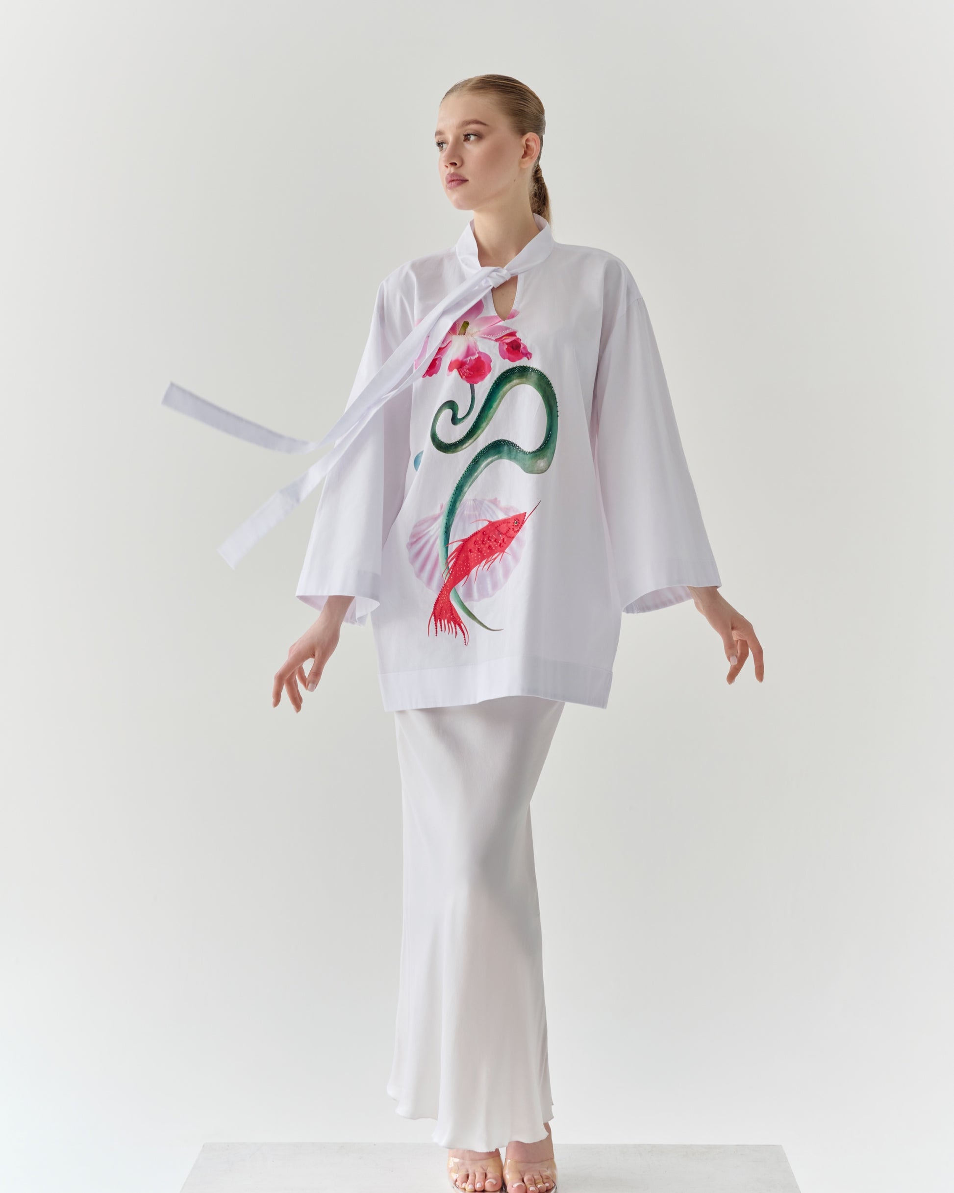 Kimono-style shirt with a V-neck, decorative scarf, and original print hand-embroidered with beads and crystals.