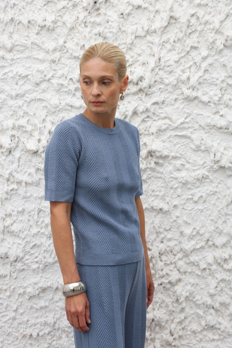 A knit jumper made of wool yarn with a dense herringbone weave that creates a vertical pattern. Straight silhouette of medium length, round neckline, long set-in sleeves. The collar, cuffs, and hem are finished with ribbed knit.