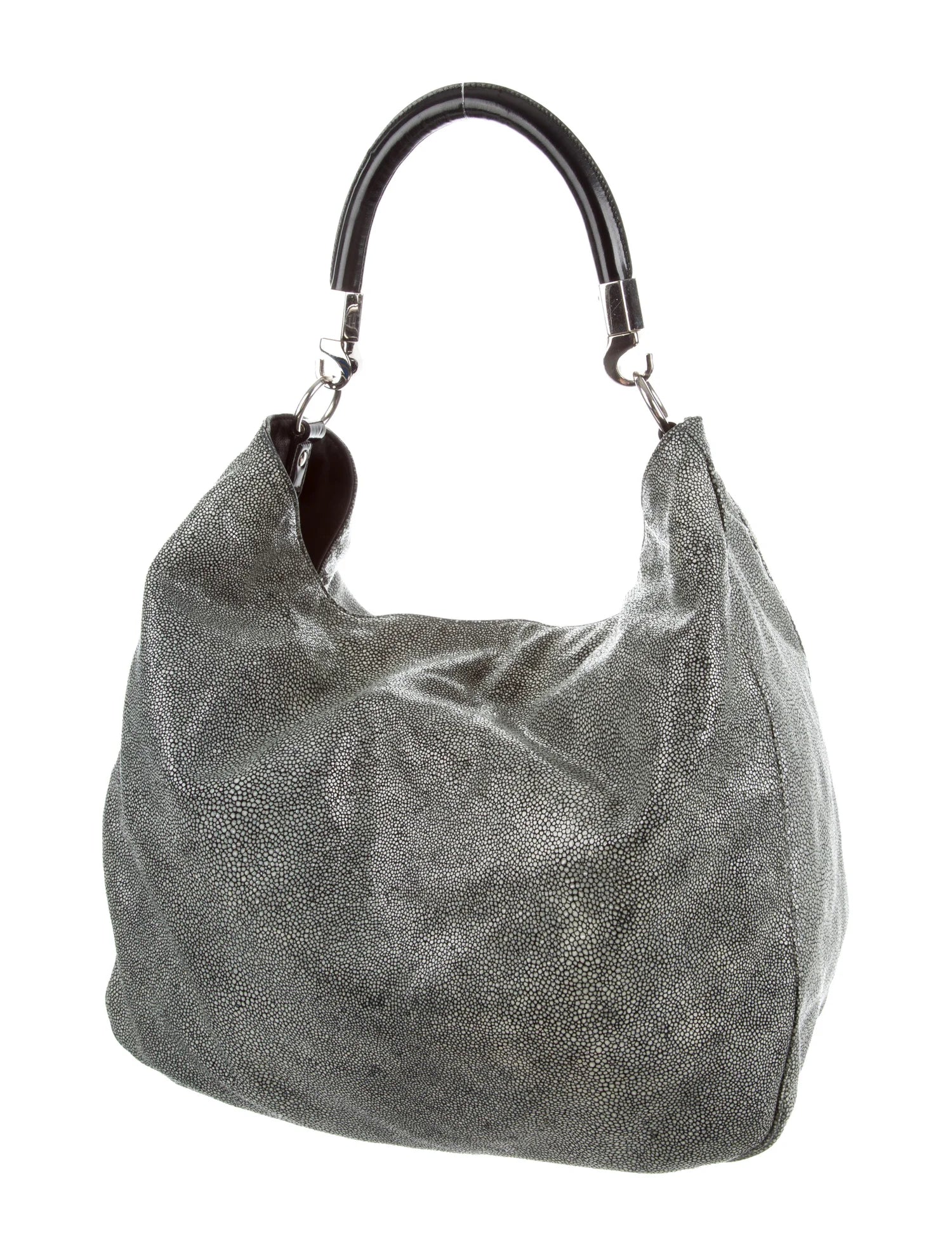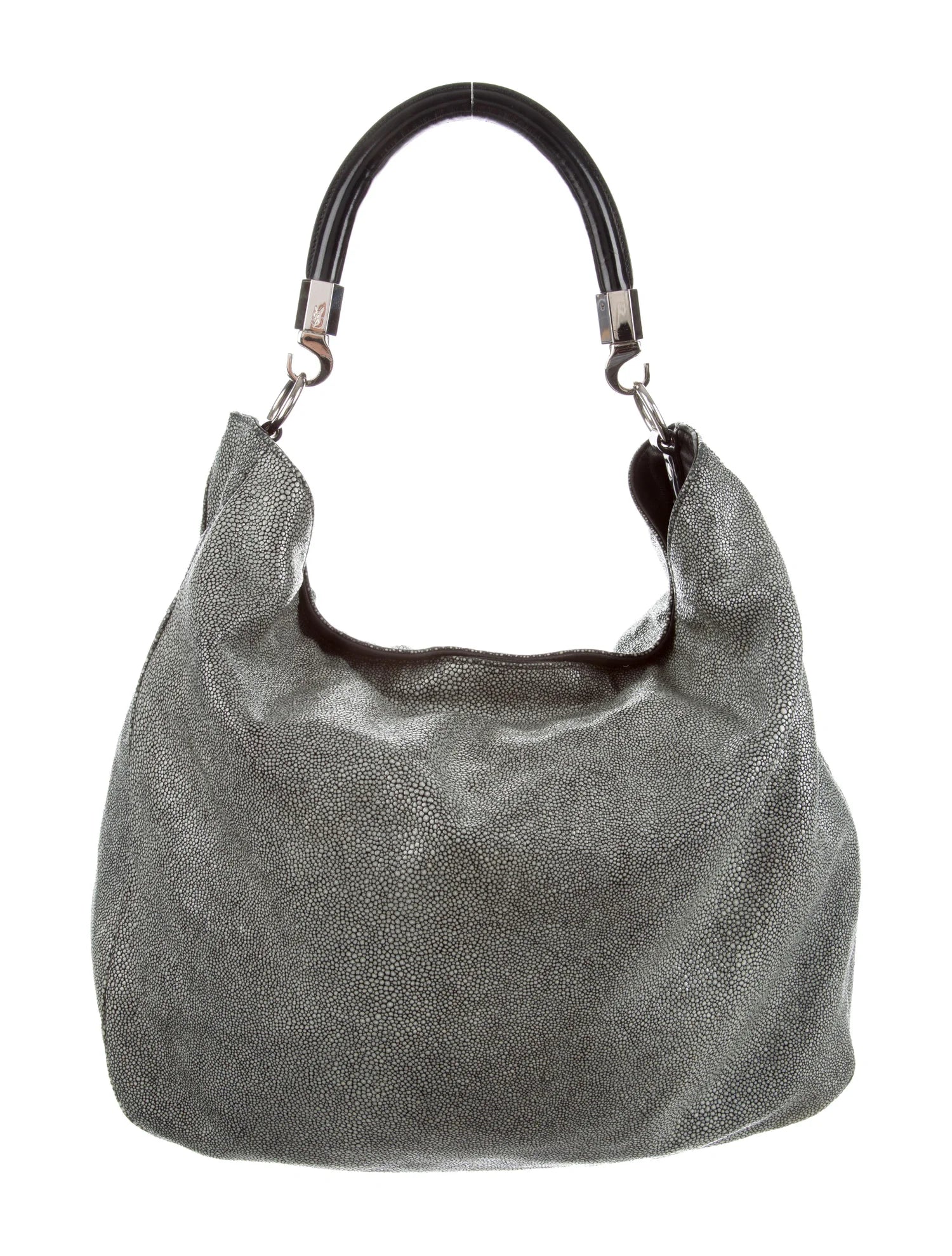 Jade stingray Yves Saint Laurent Roady bag with silver-tone hardware, black leather trim, single rolled shoulder strap, tonal satin lining, three pockets at interior walls and magnetic snap closure at top.