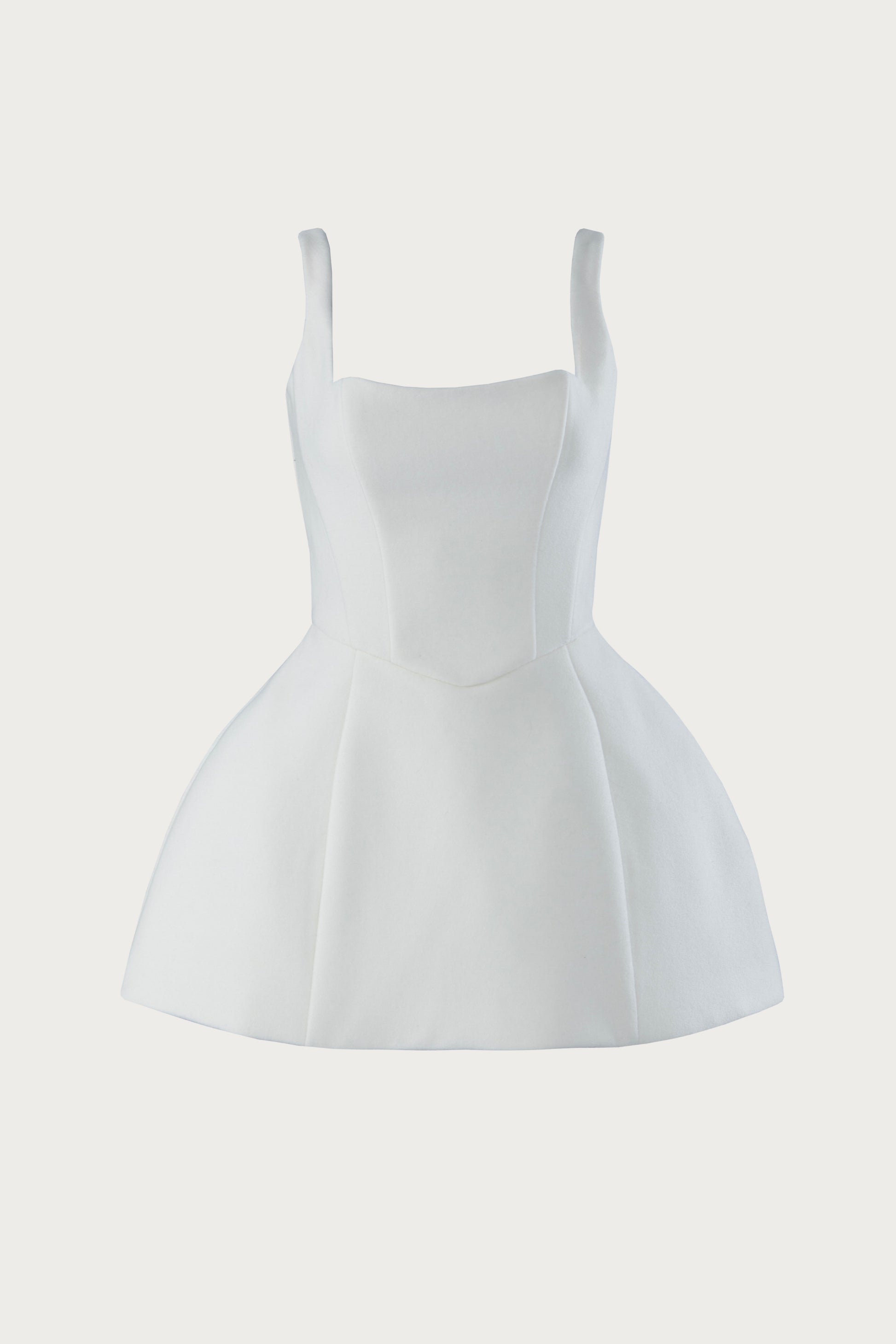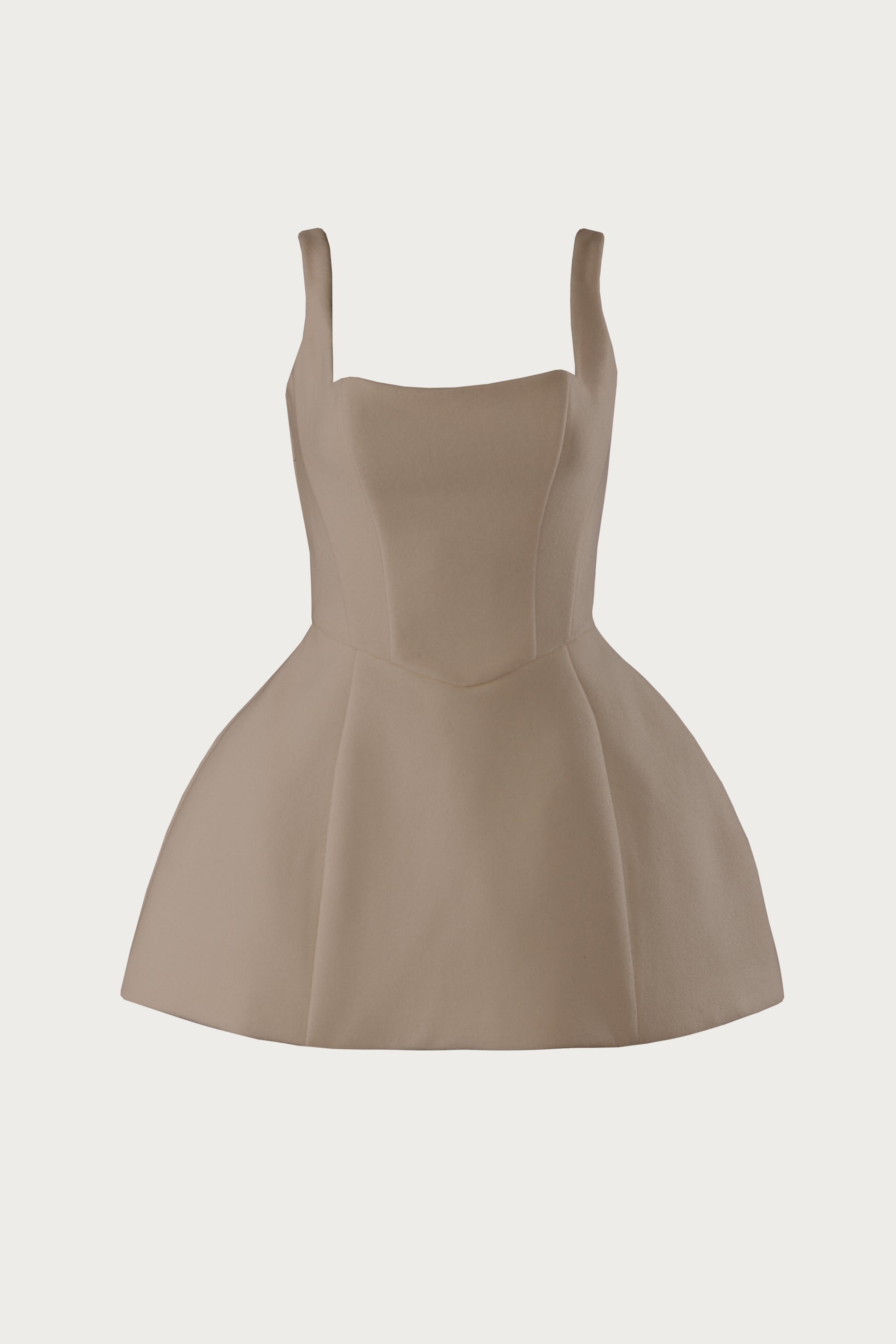 Tailored cashmere dress, designed with a structured silhouette that highlights the waistn with a boned corset. The boning flows into the skirt, adding support and shaping. Short in length and universally flattering, this items combines retro elegance with a contemporary aesthetic fit for any occasion.