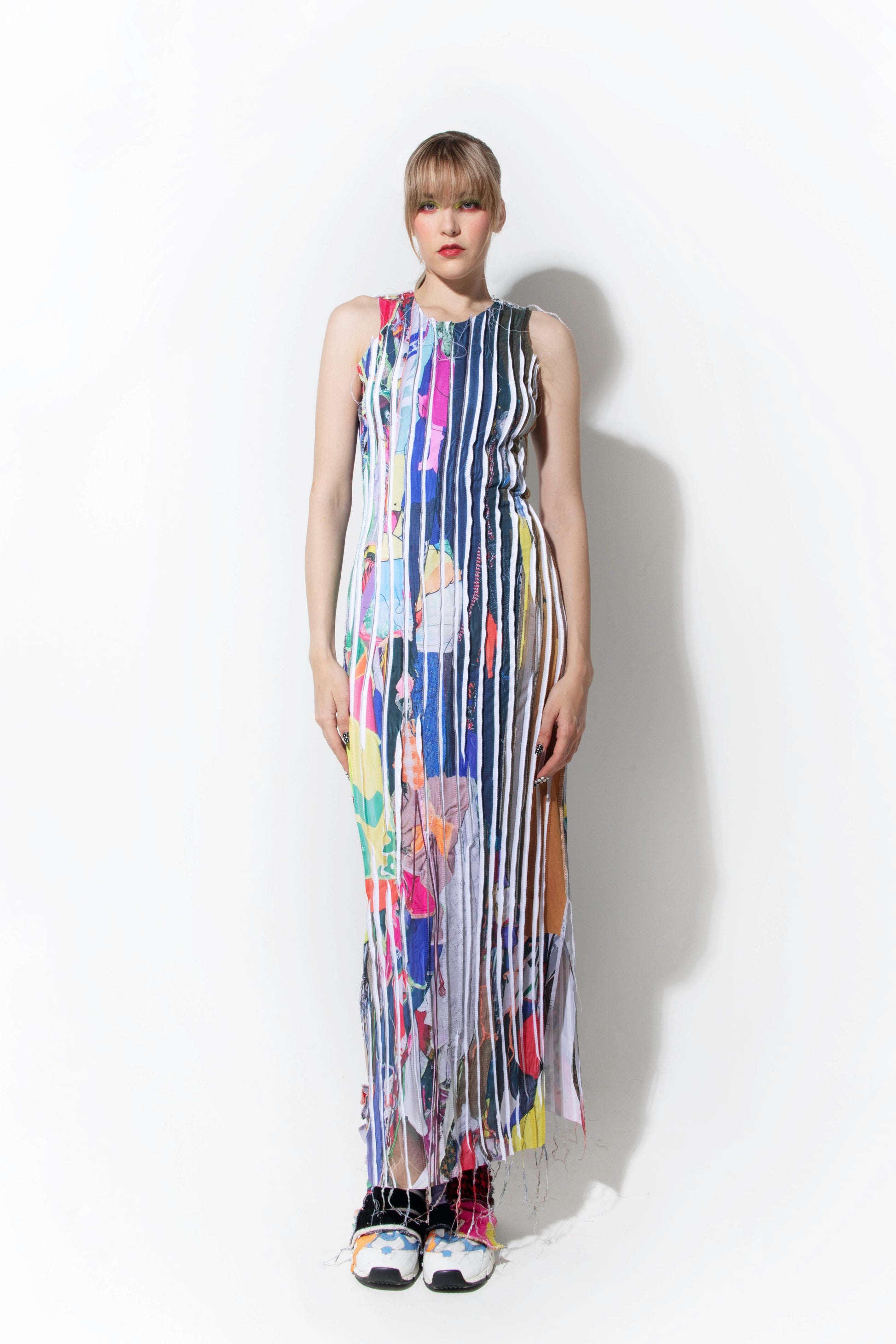 A stretch-fit, textured, and printed dress. The Illusion Dress features an original collage of BORBALA patchworks and raw hemlines throughout.