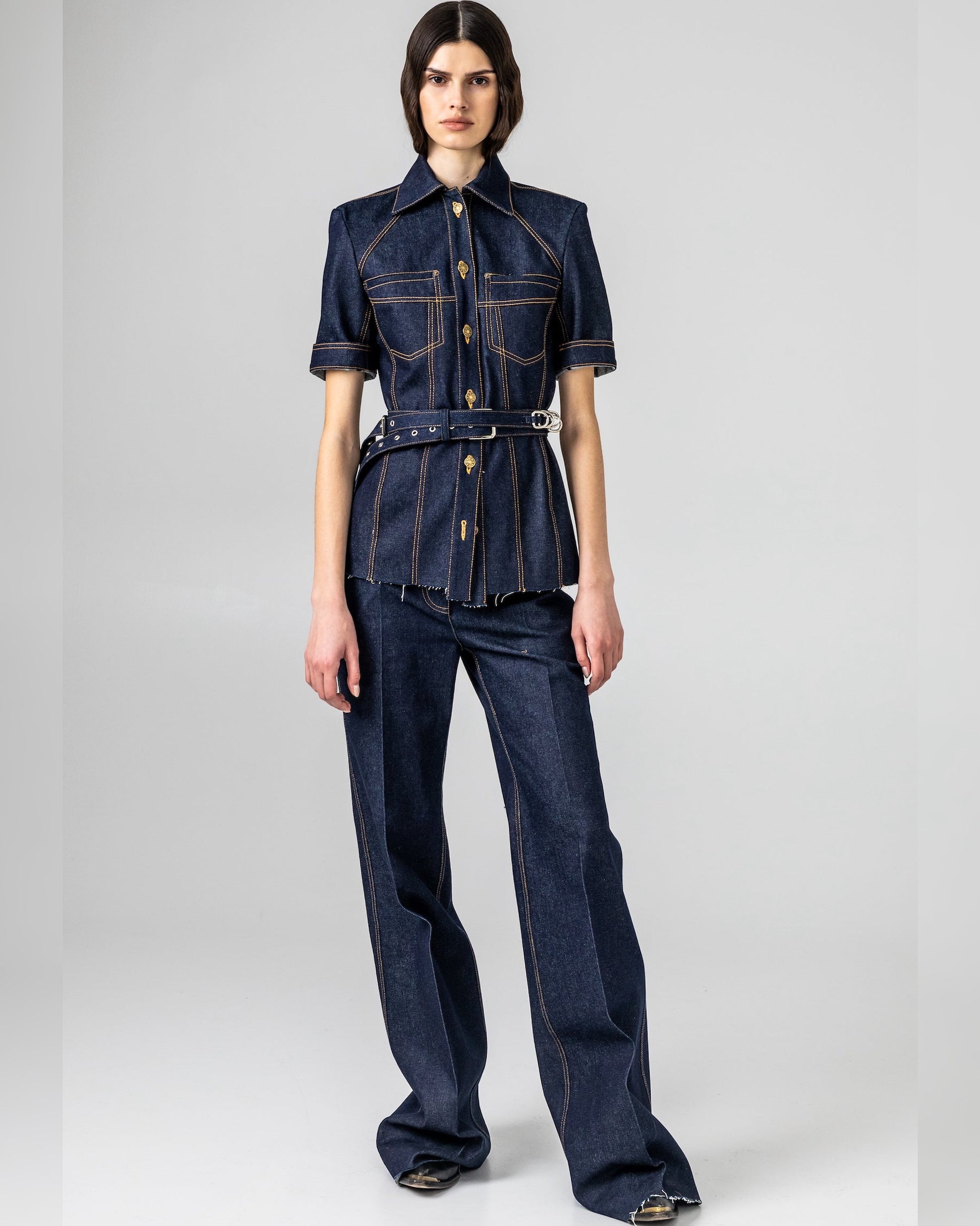 - Classic denim construction with decorative seams for a tailored look;