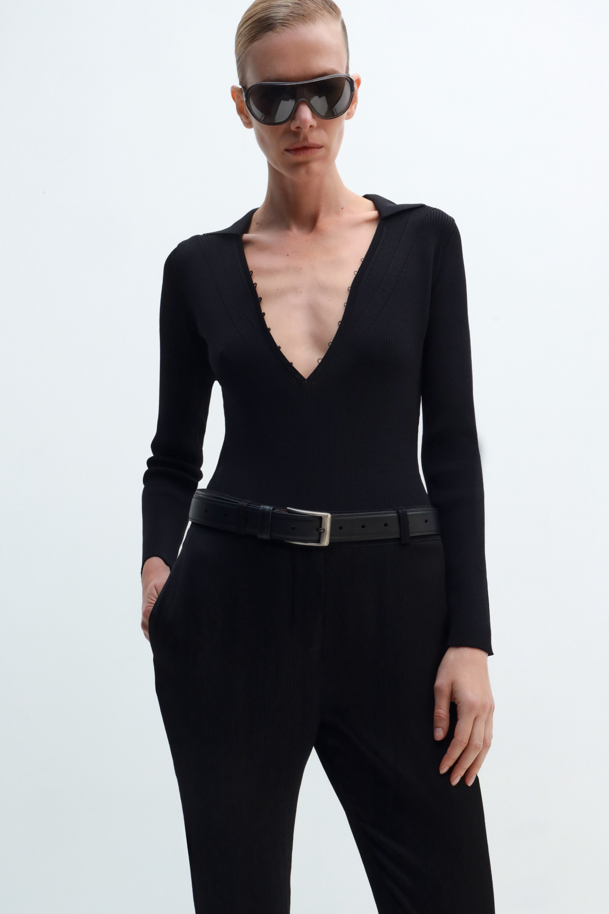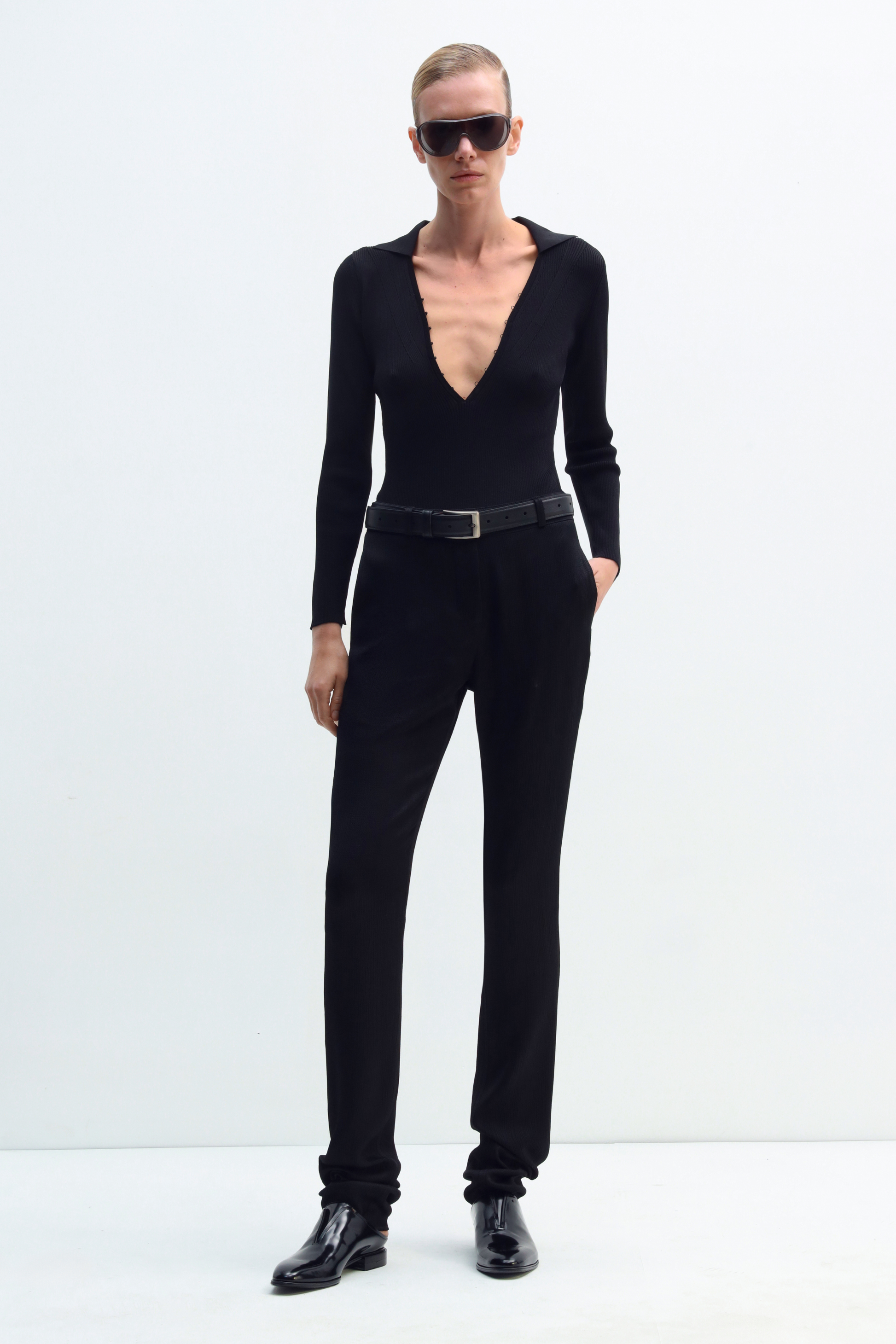 LOW-RISE STRAIGHT-LEG TROUSERS WITH SIDE POCKETS AND BACK YOKE. ZIP AND BUTTON CLOSURE. WAISTBAND WITH BELT LOOPS
