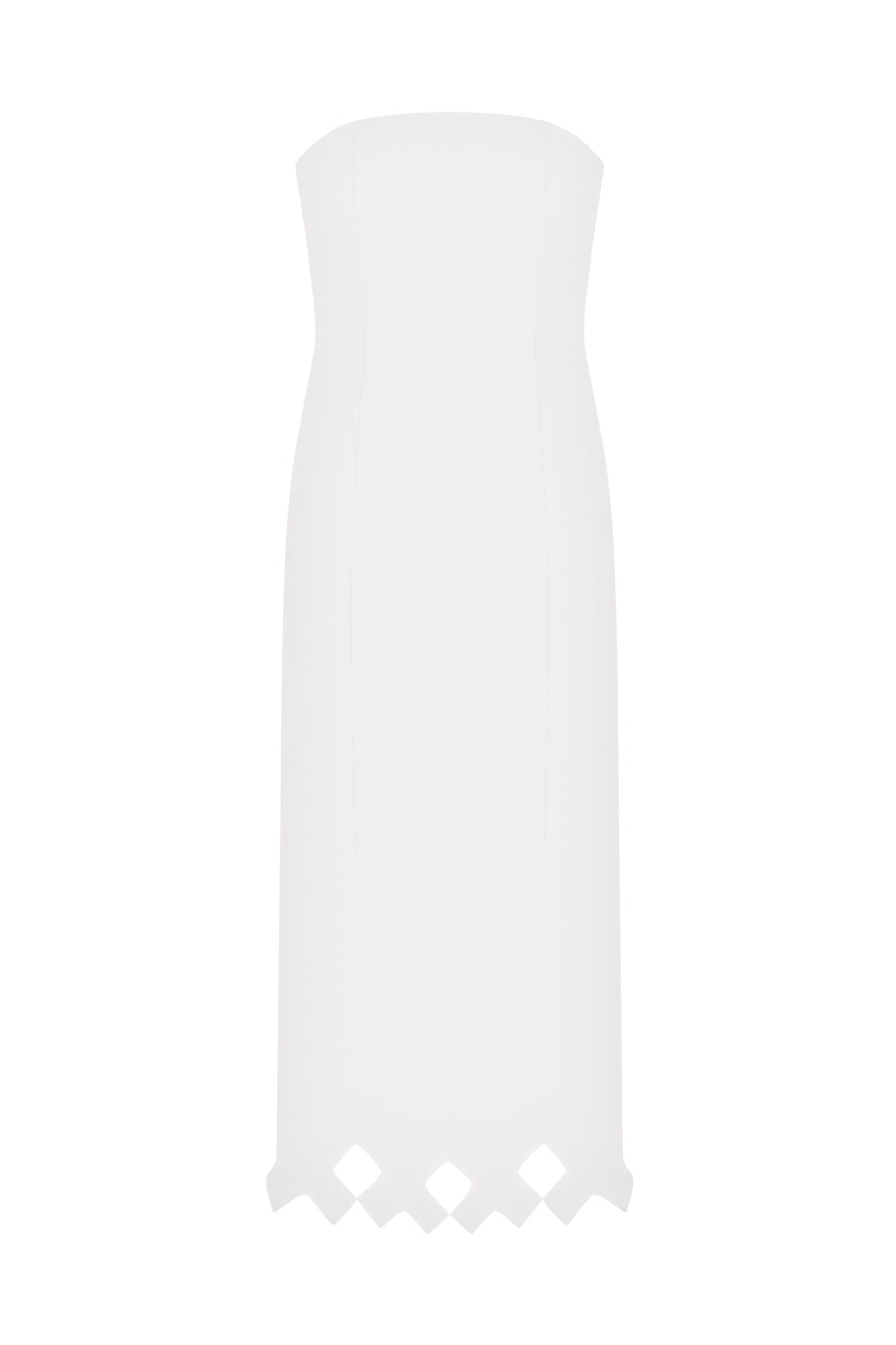 Strapless fitted midi dress in viscose with back zip closure, center-back vent, and scalloped bottom