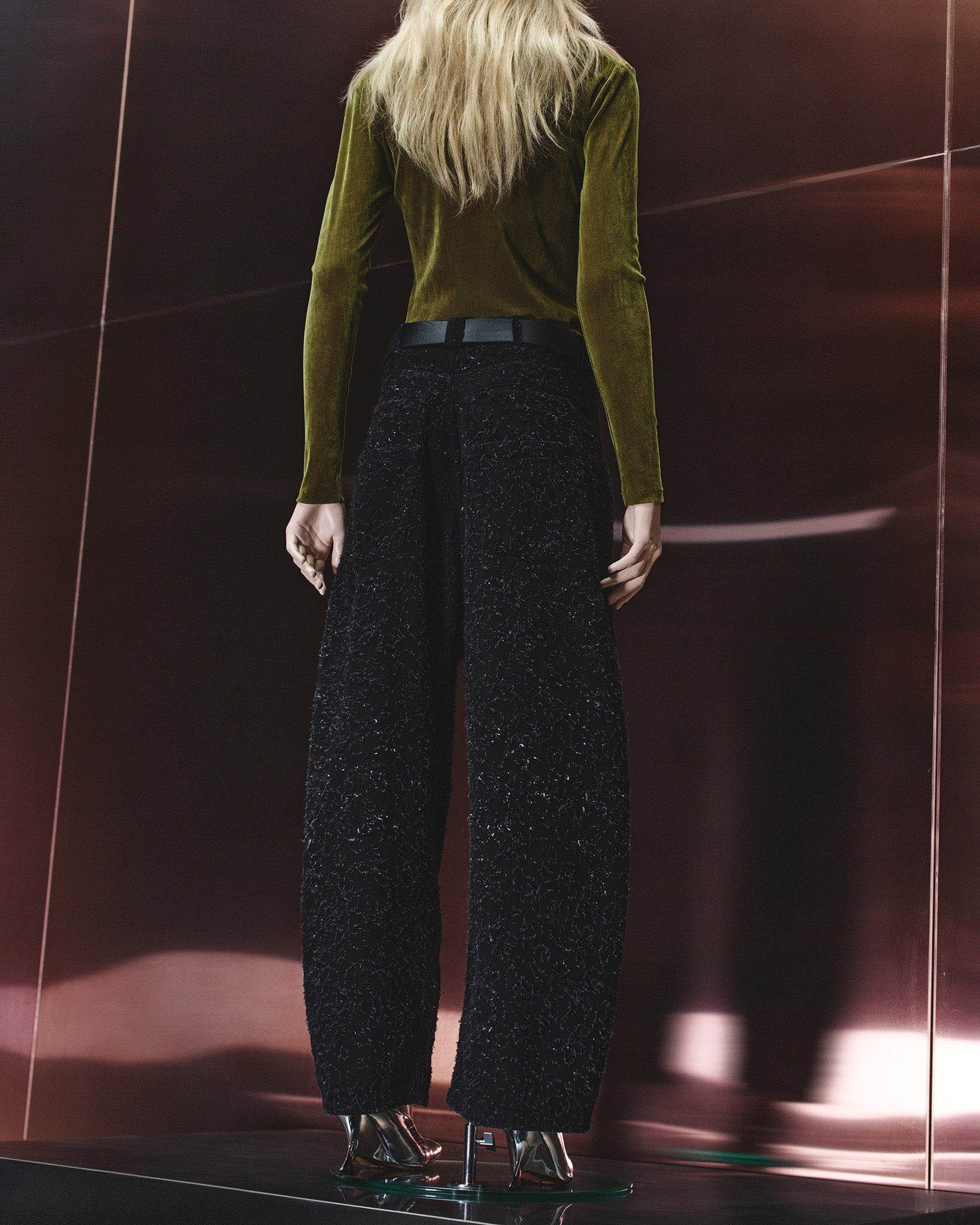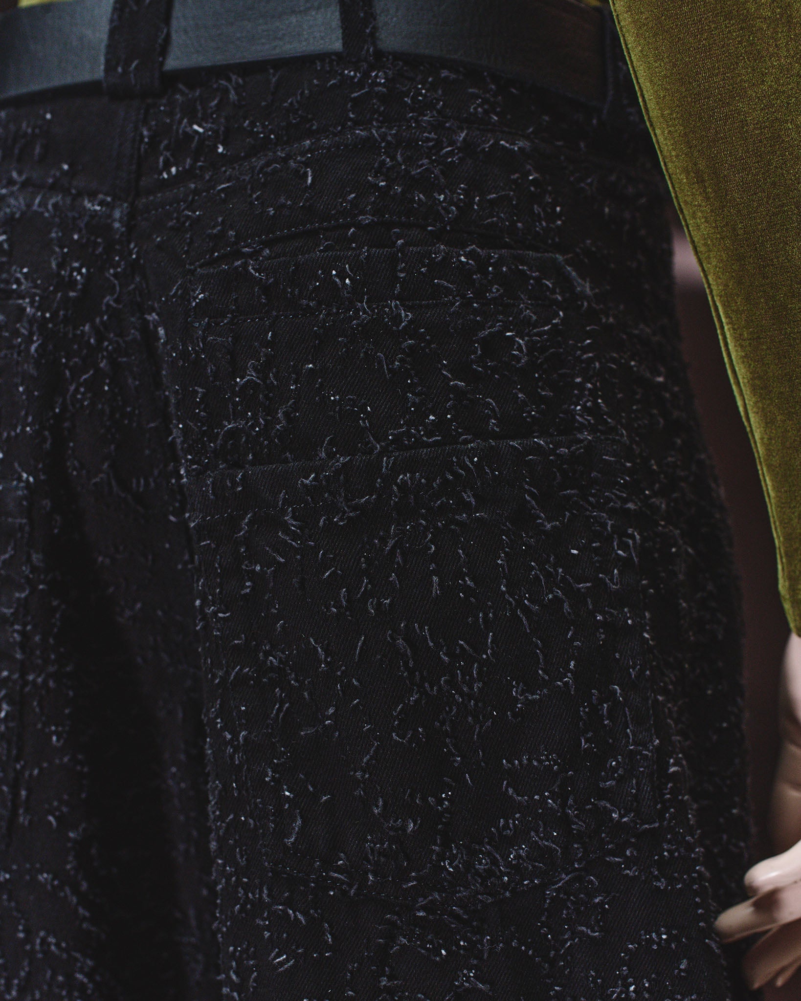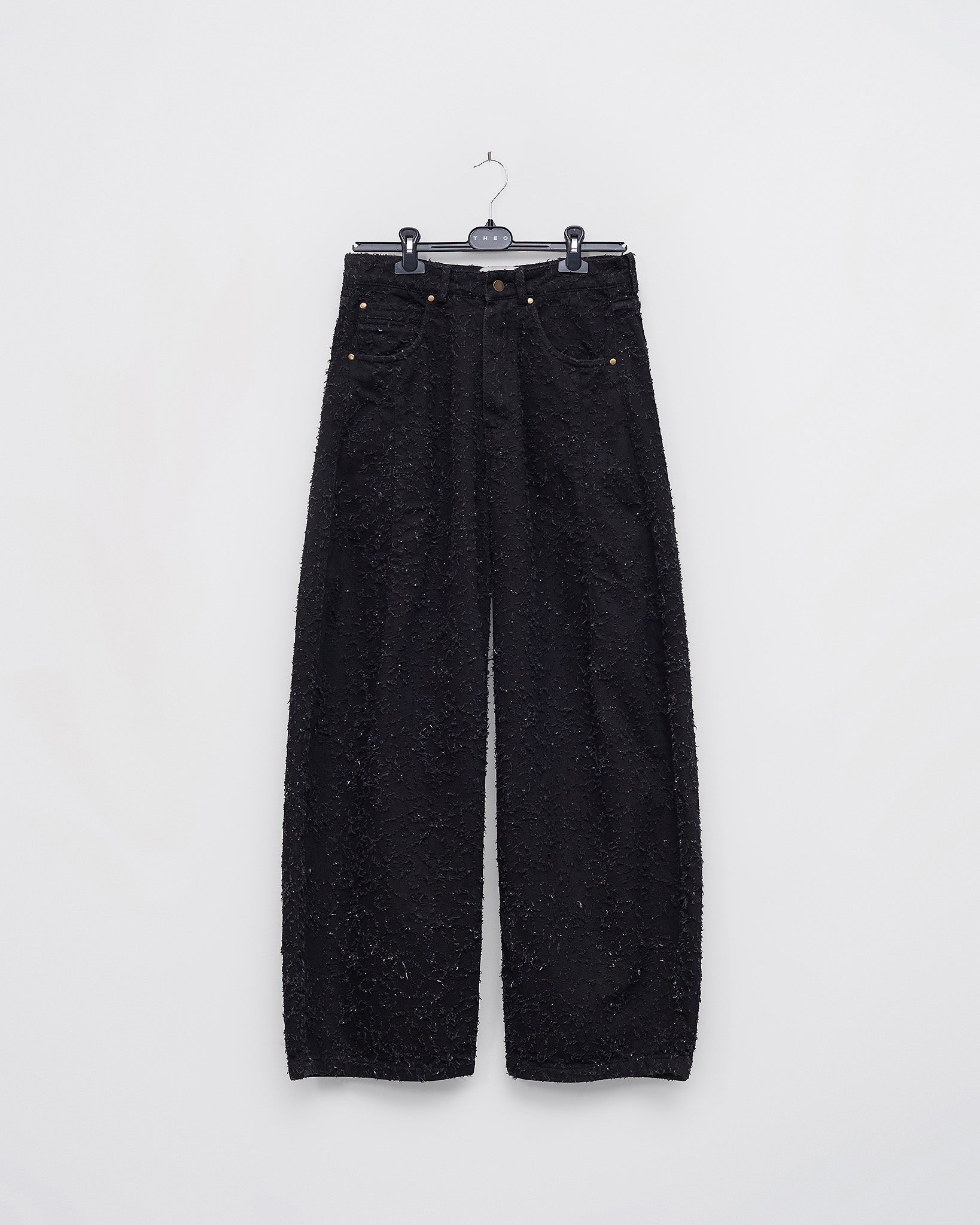 The Umbra Jeans are an exploration of material and shadow, offering a modern interpretation of oversized tailoring. They are constructed from a unique textured black denim, a material distinguished by its intricate, tactile surface and its deep, light-absorbing hue. This garment merges a relaxed, flowing form with a compelling finish, creating a statement piece that is both visually and physically engaging.