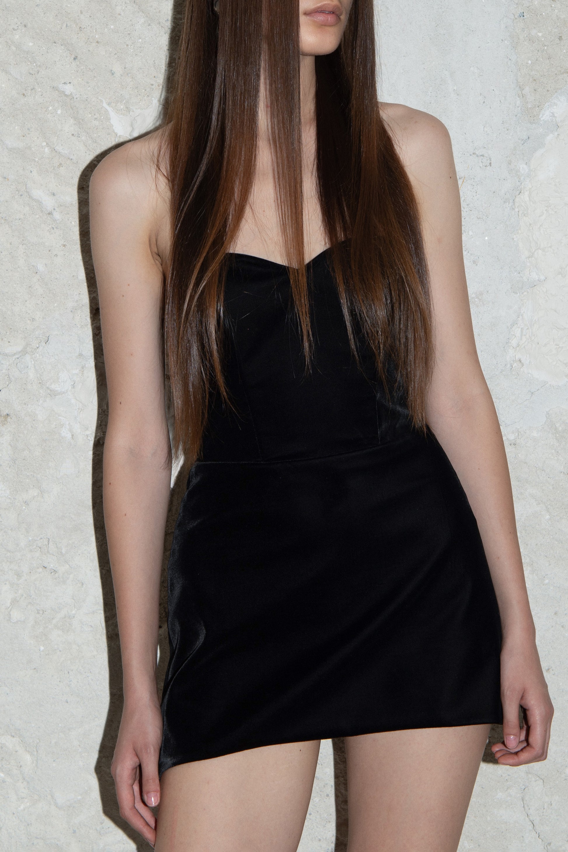 Black , strapless mini dress with a sweetheart neckline , made from velvet and with a minimalistic design.