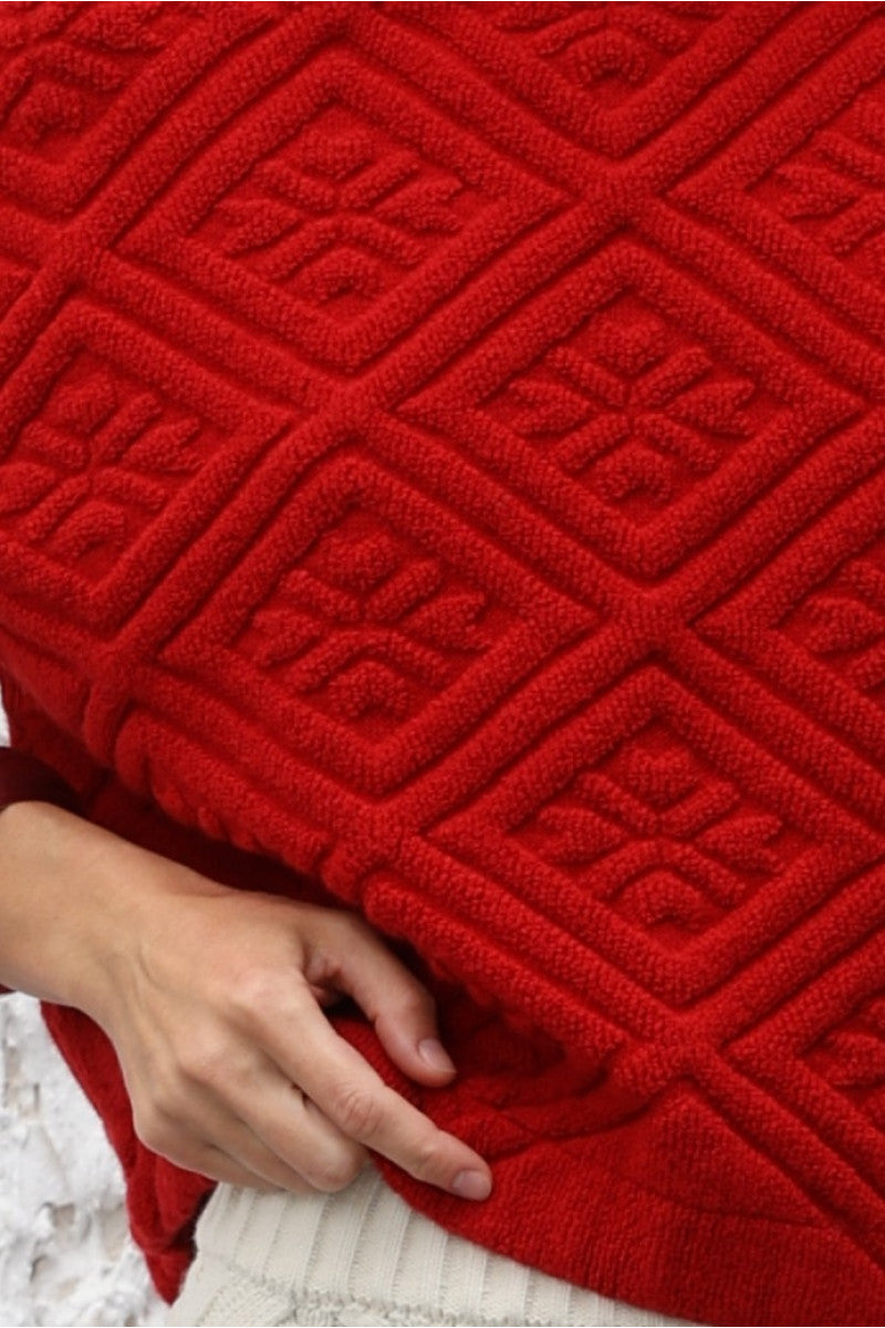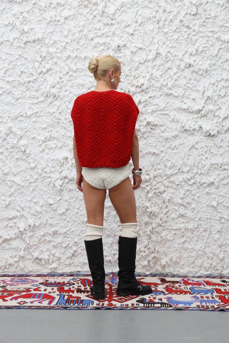 Oversized voluminous vest with a weave imitating sheared Aran fleece. Length — below the waist. Features a round neckline and dropped shoulders. Neckline, armholes, and hem finished in ribbed knit.