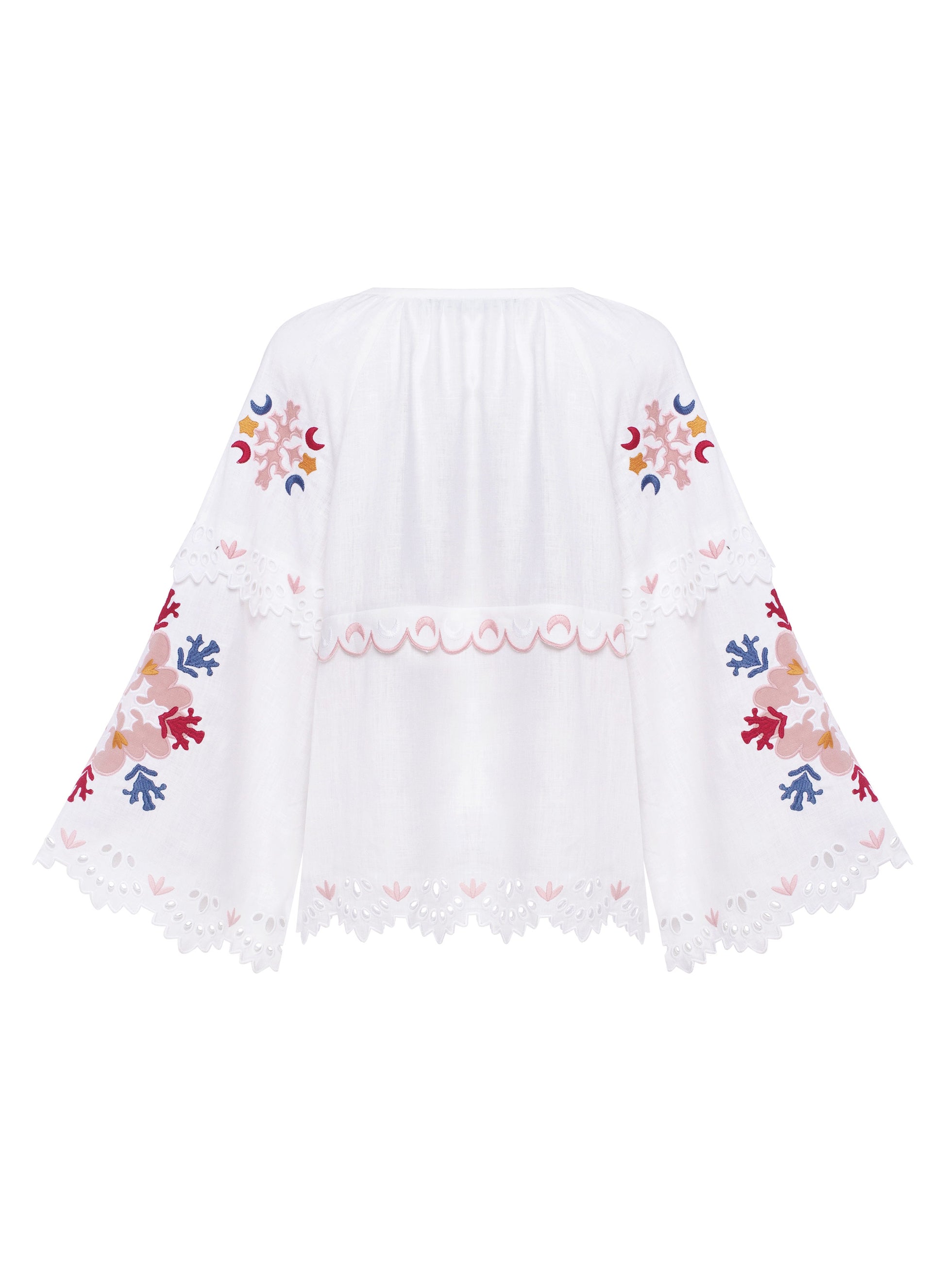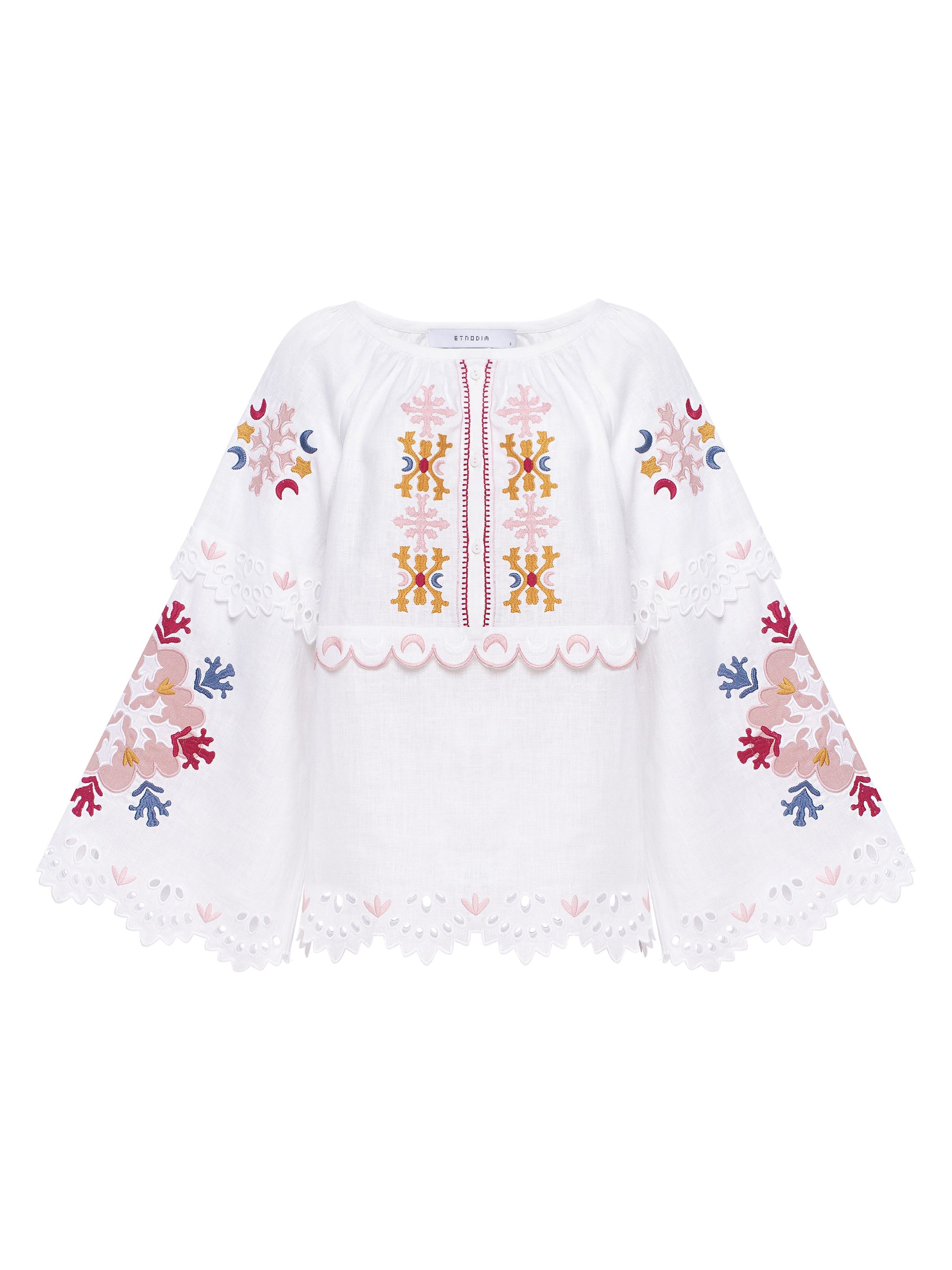 A white linen blouse inspired by the work of multidisciplinary artist Paraska Plytka-Horytsvit.