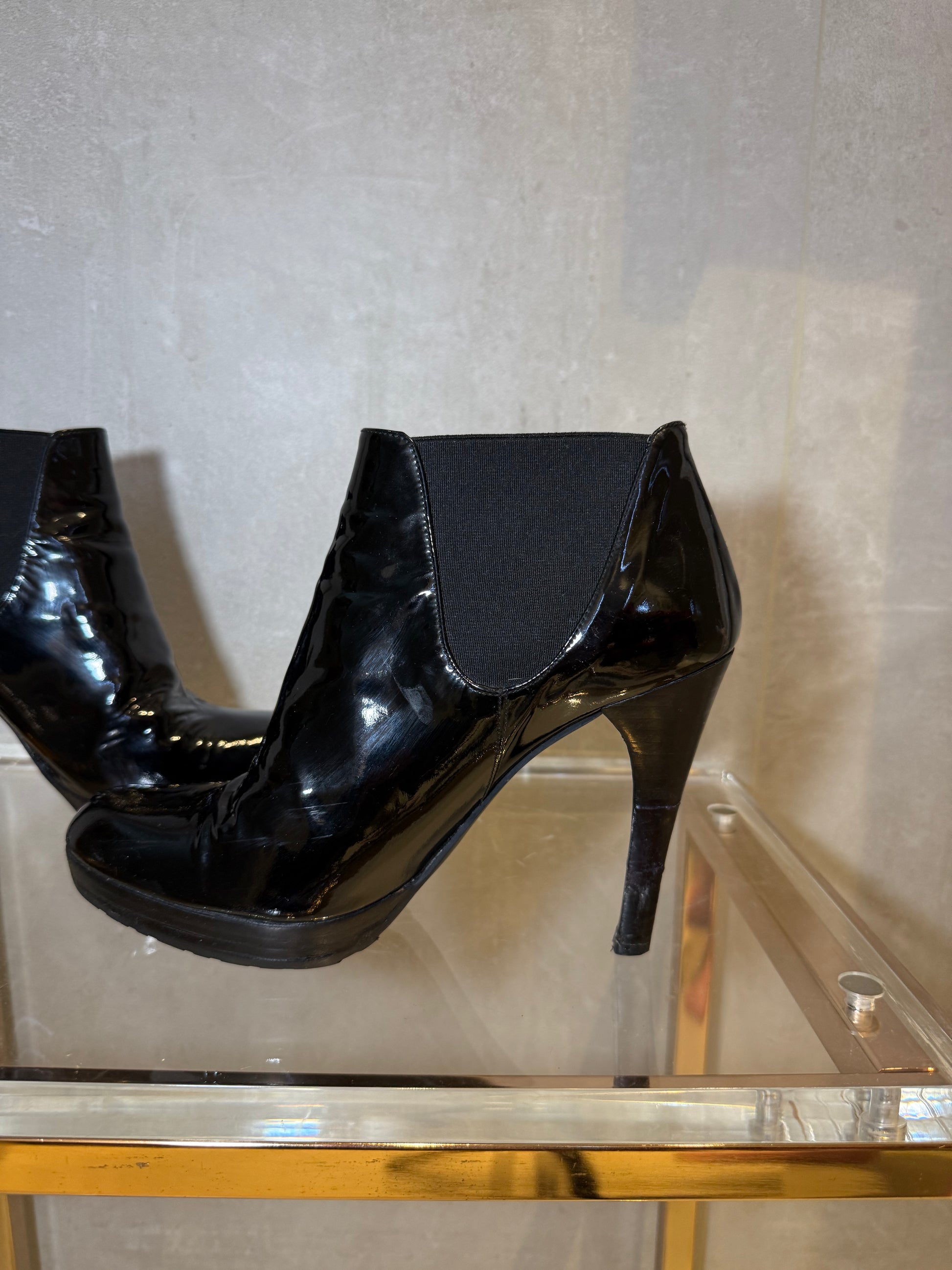 Light signs of wear are present, including minor scuffing on the toe area and small marks on the heels, consistent with normal use. The patent leather remains glossy. Please refer to the photos for detailed condition.