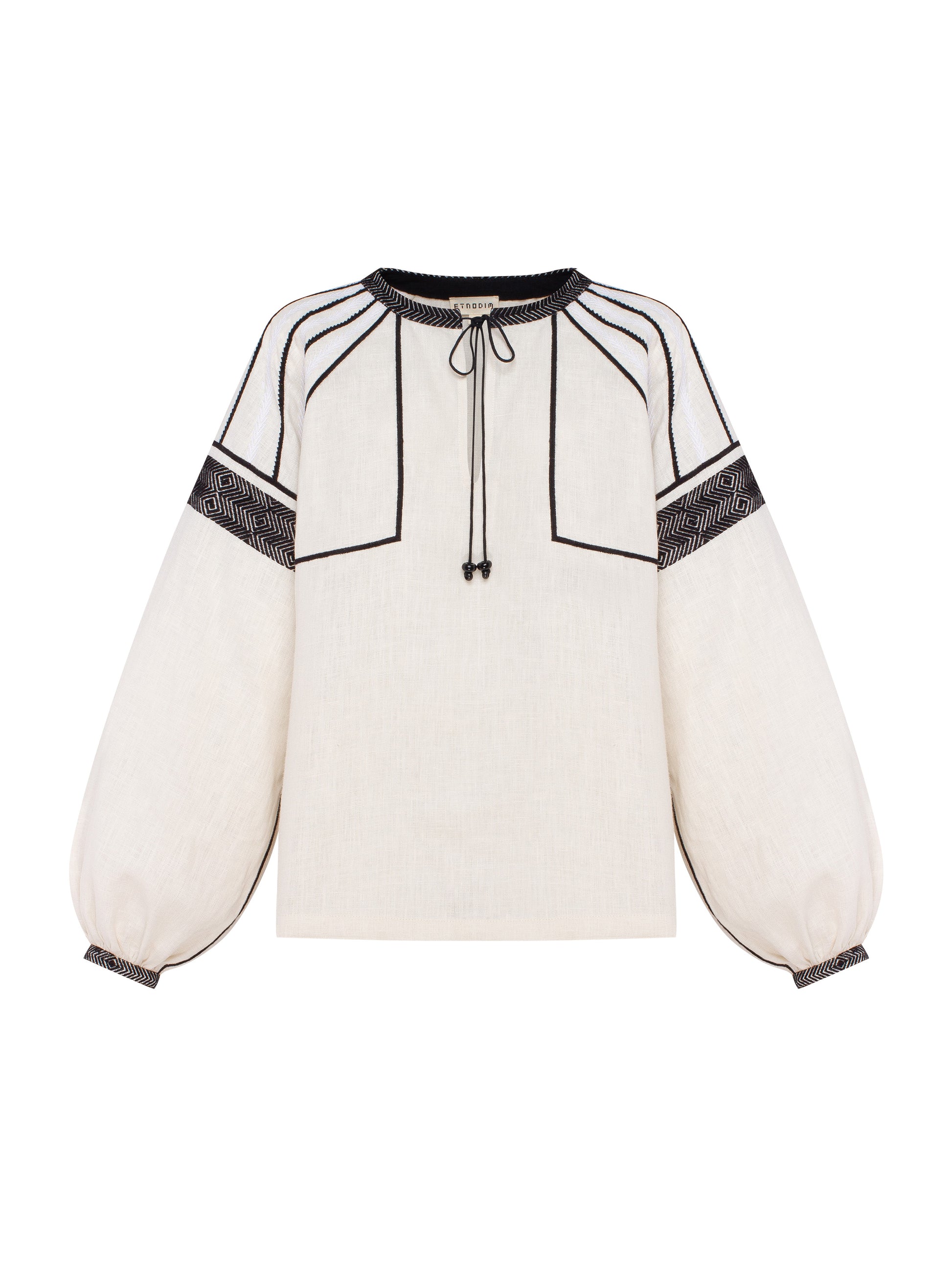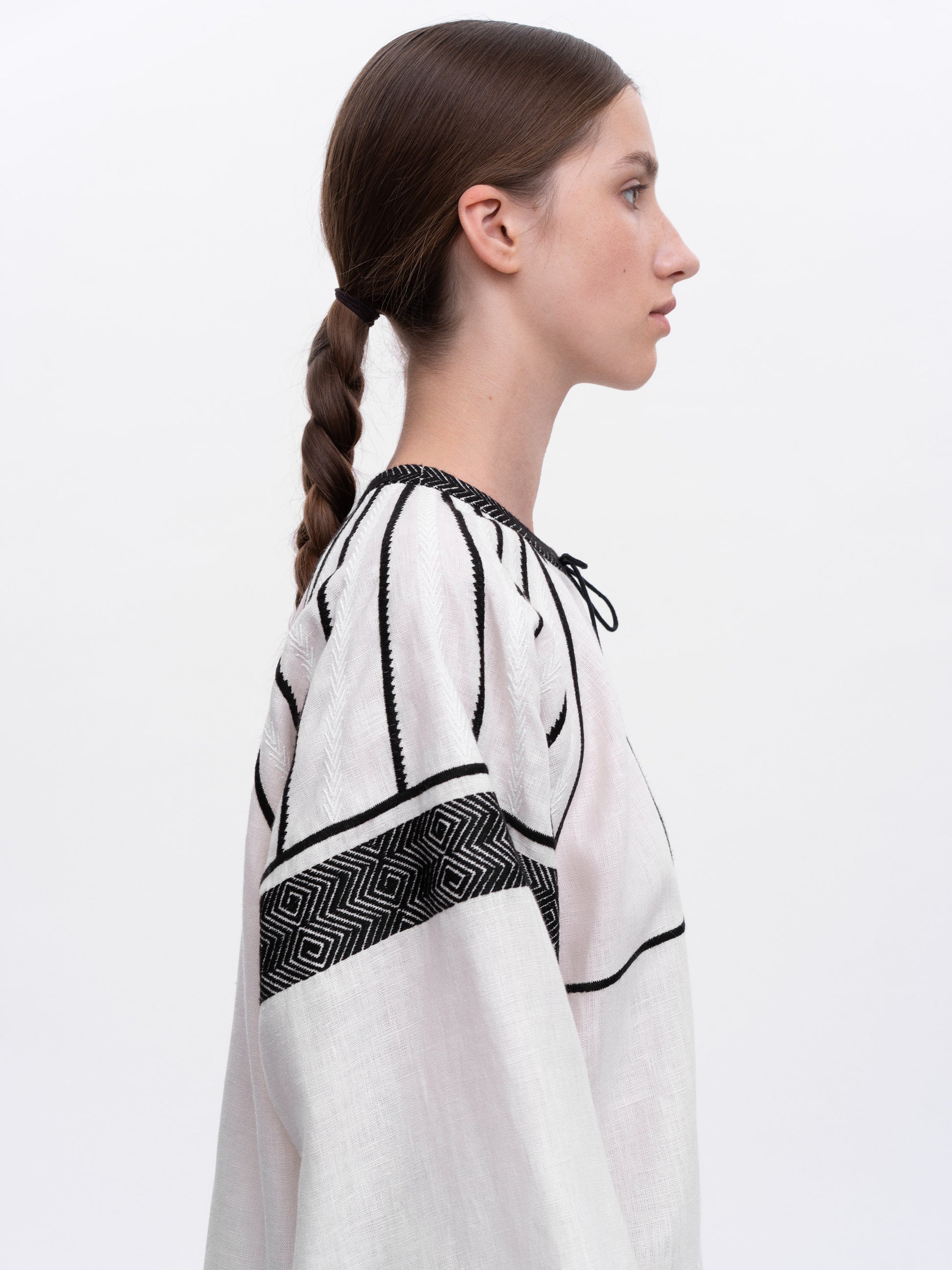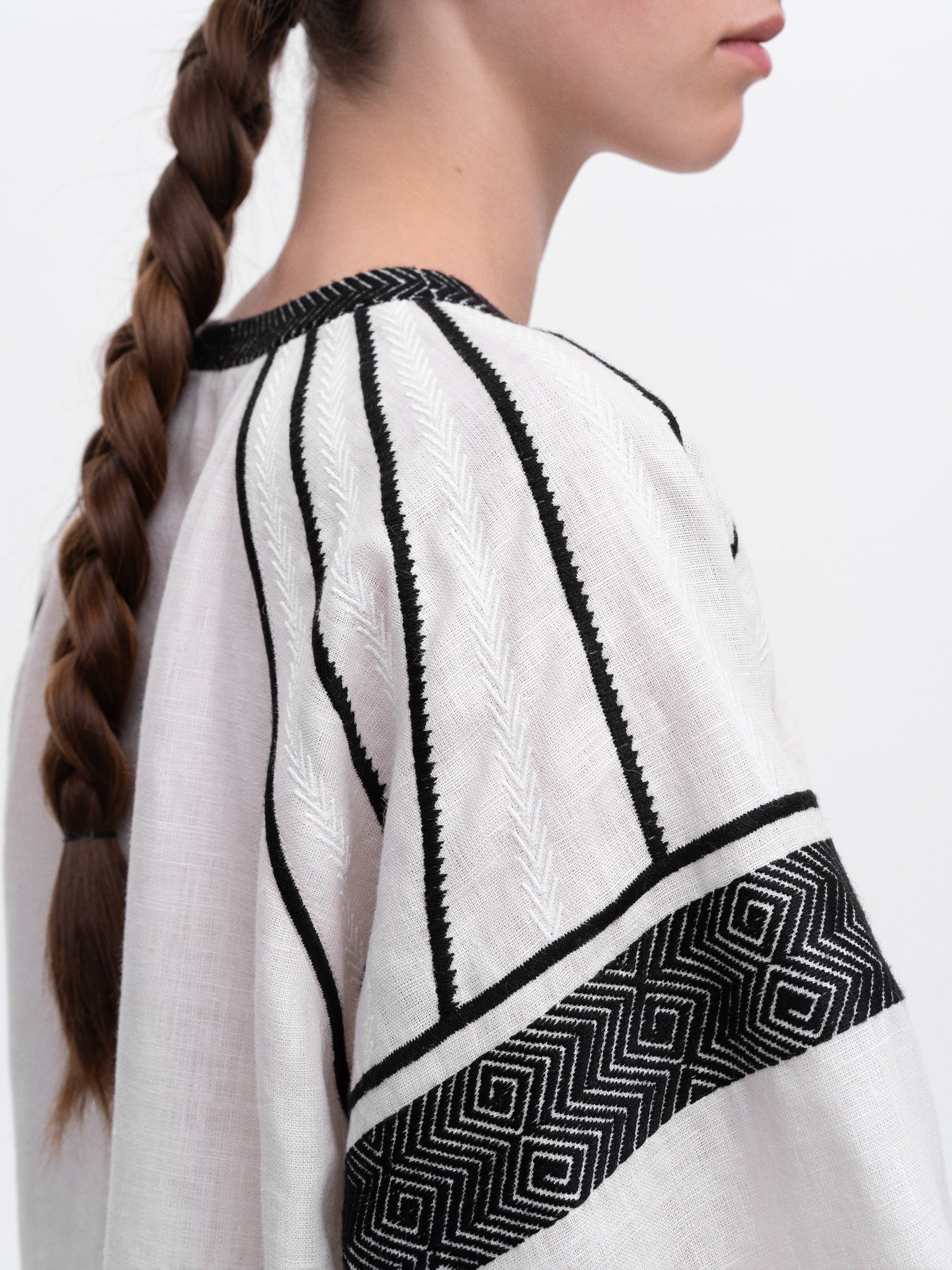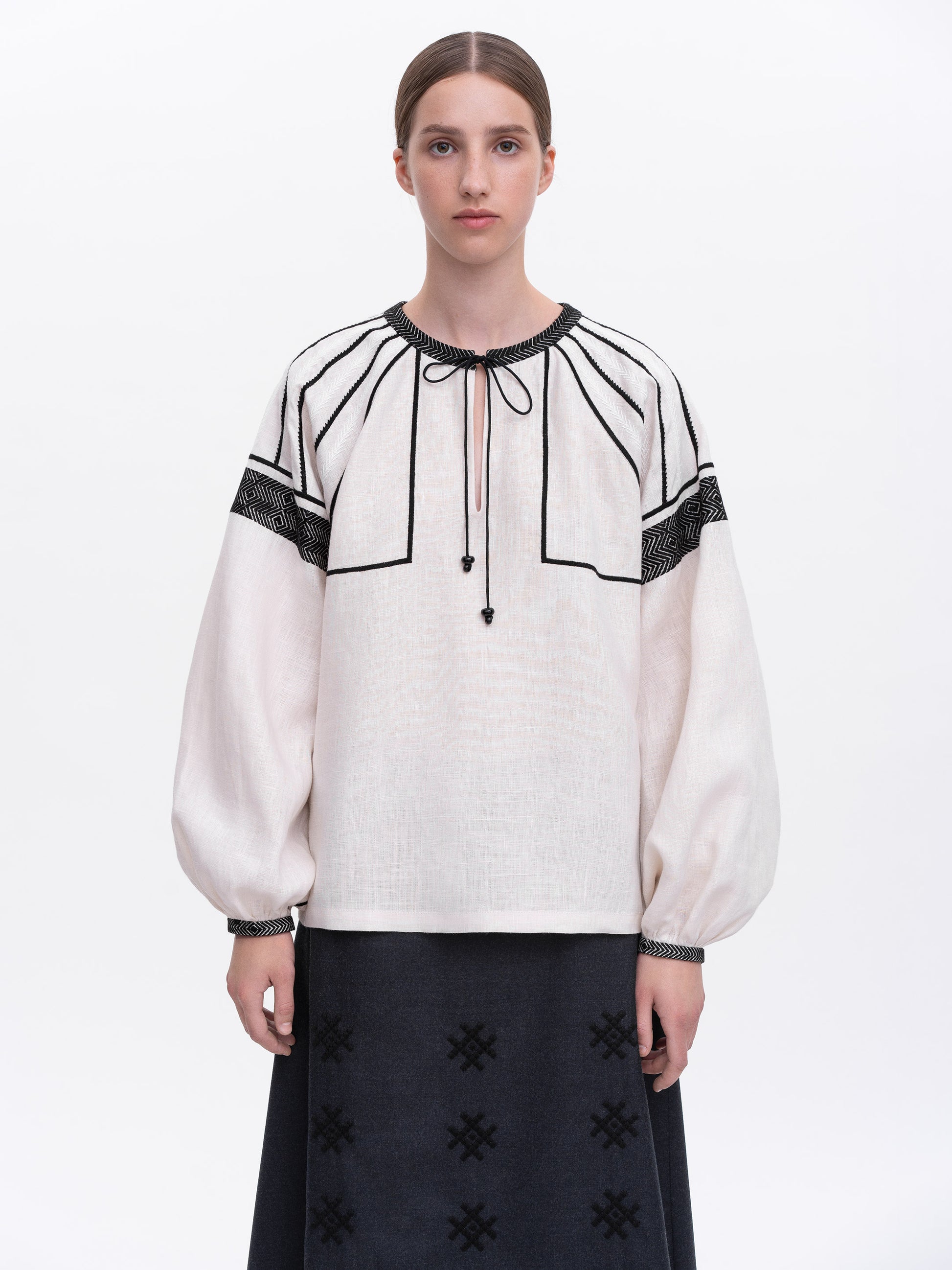 Linen shirt inspired by the ornamental composition of the Mizyn bracelet, one of Ukraine’s oldest archaeological finds.