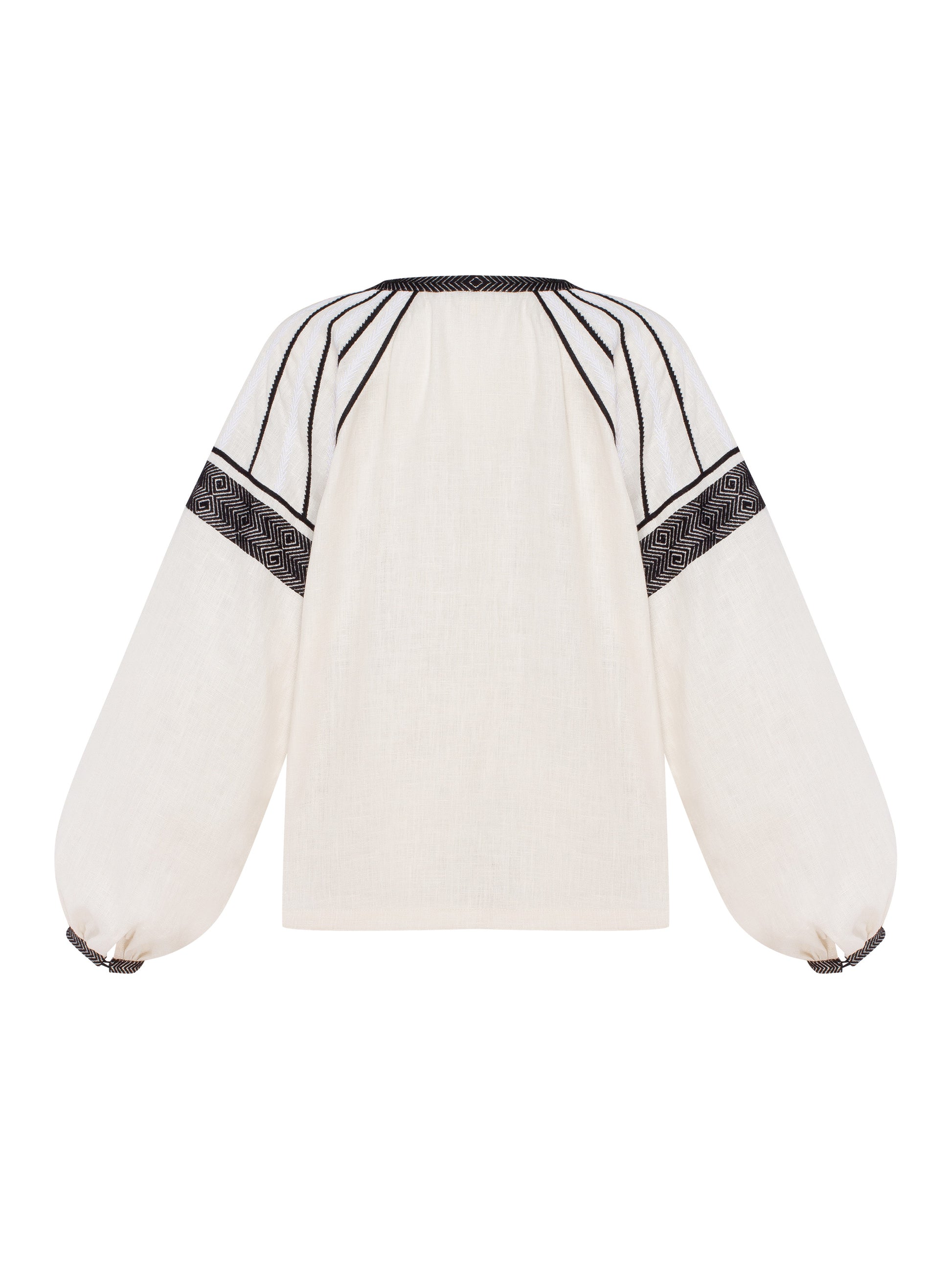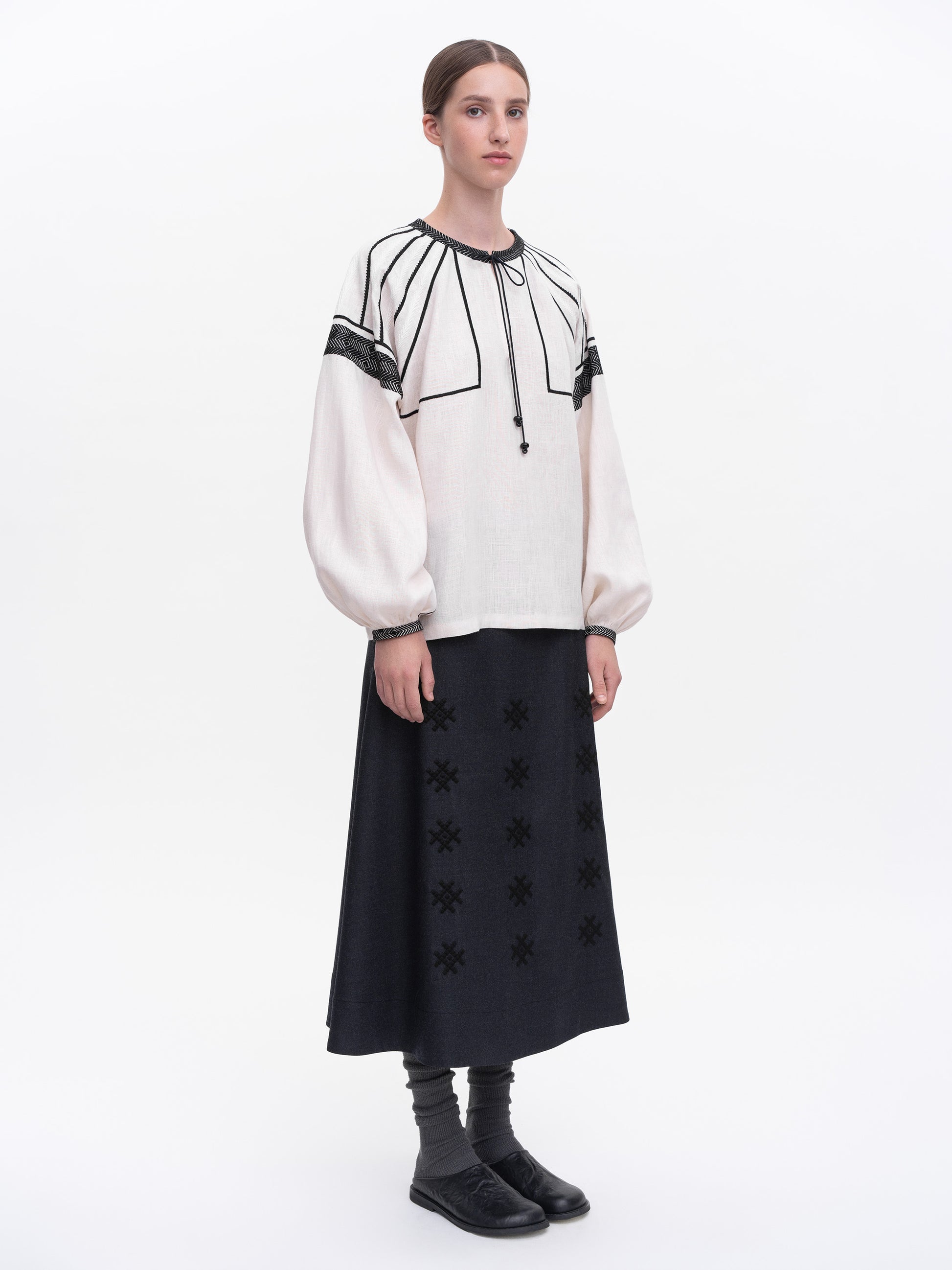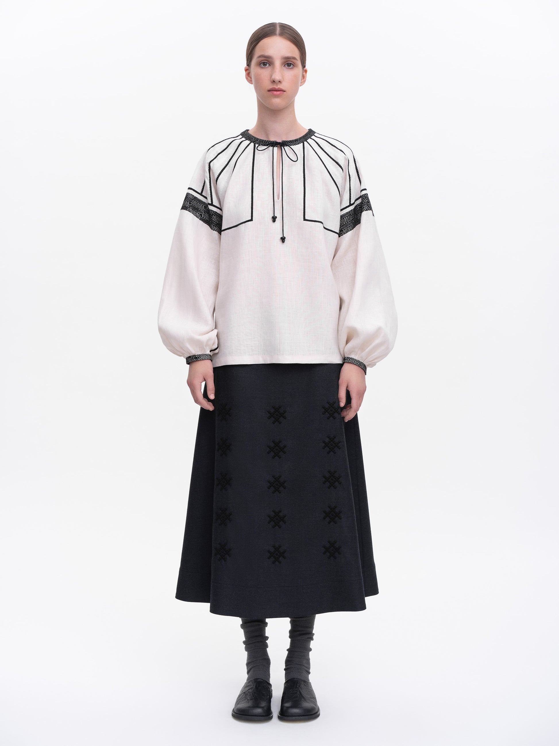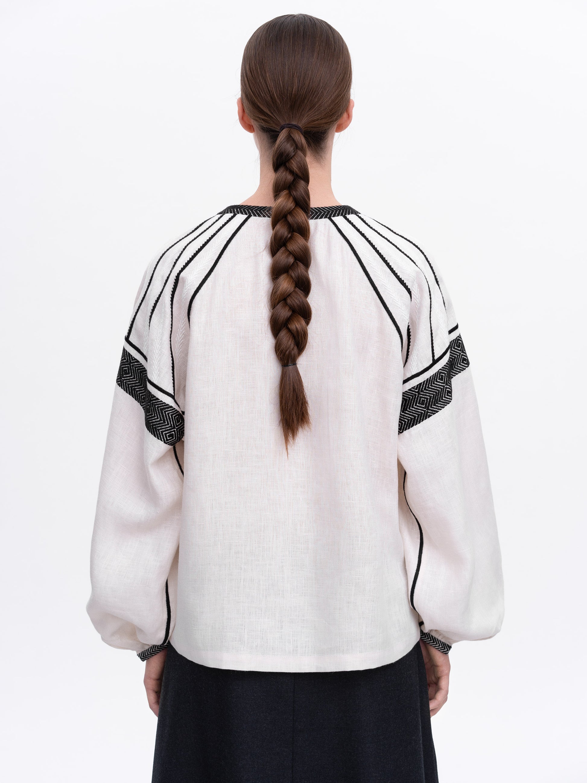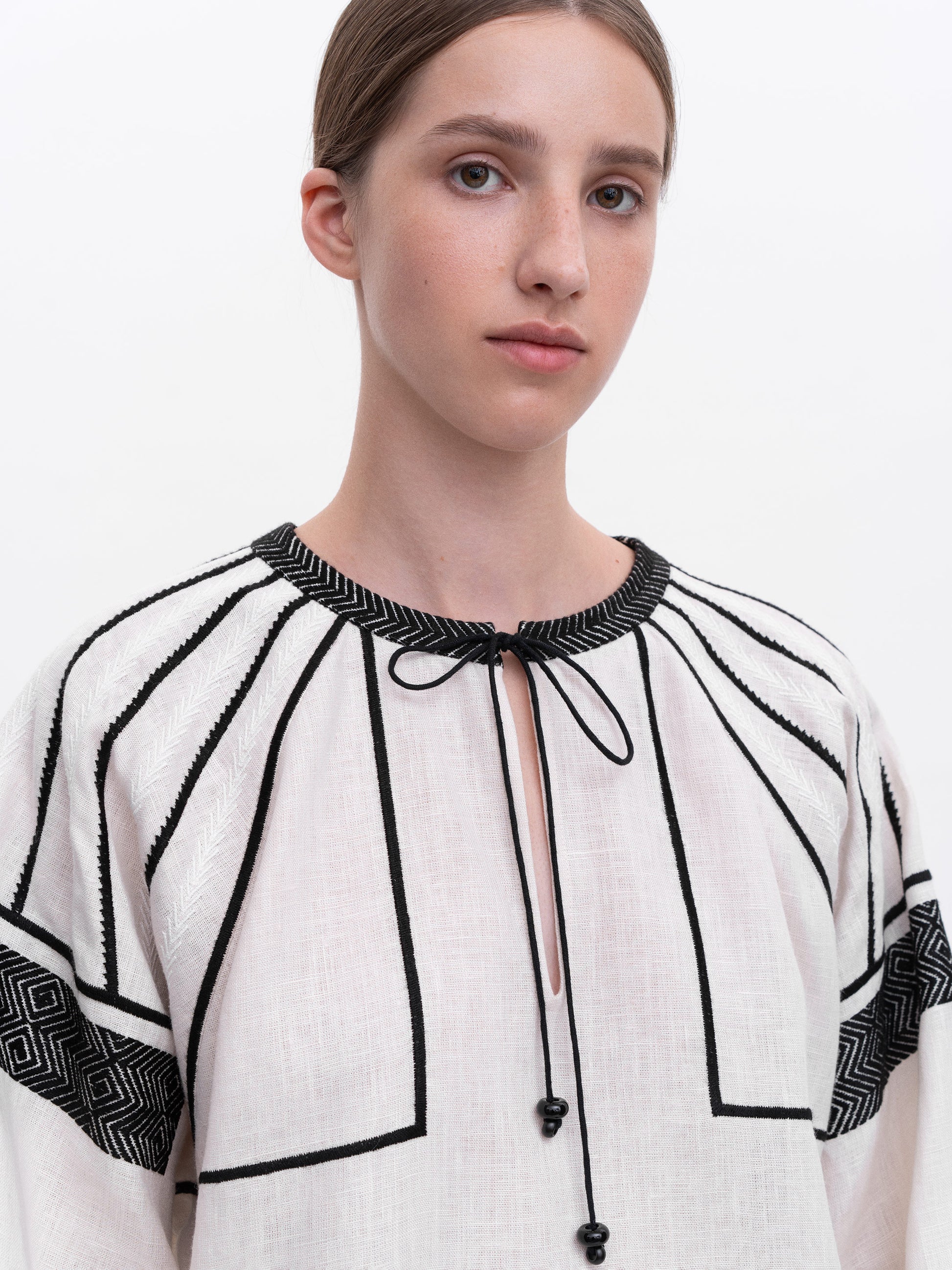 Linen shirt inspired by the ornamental composition of the Mizyn bracelet, one of Ukraine’s oldest archaeological finds.