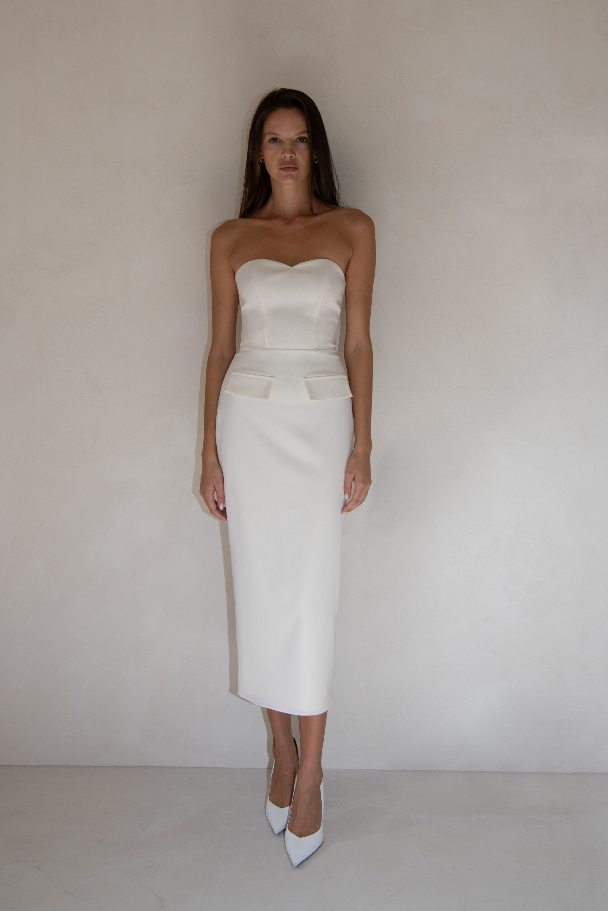 Midi dress crafted in wool fabric, featuring a corset top, decorative flap pockets, concealed zip closure and back slit.